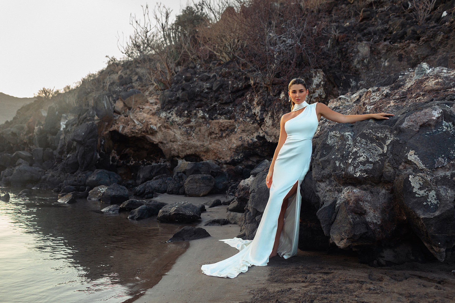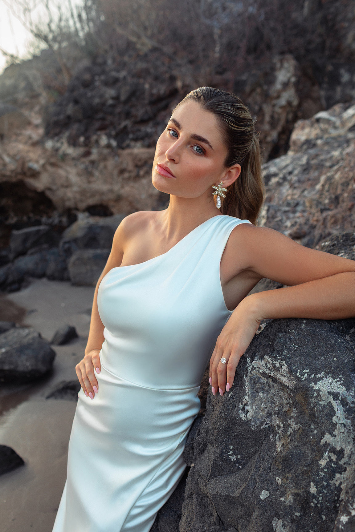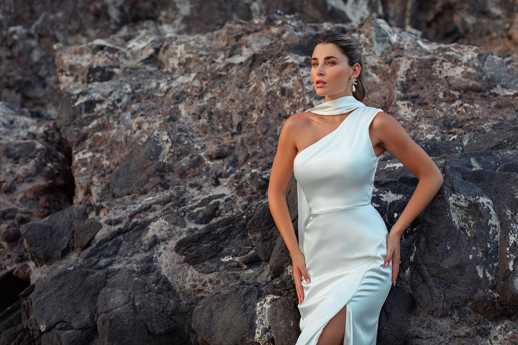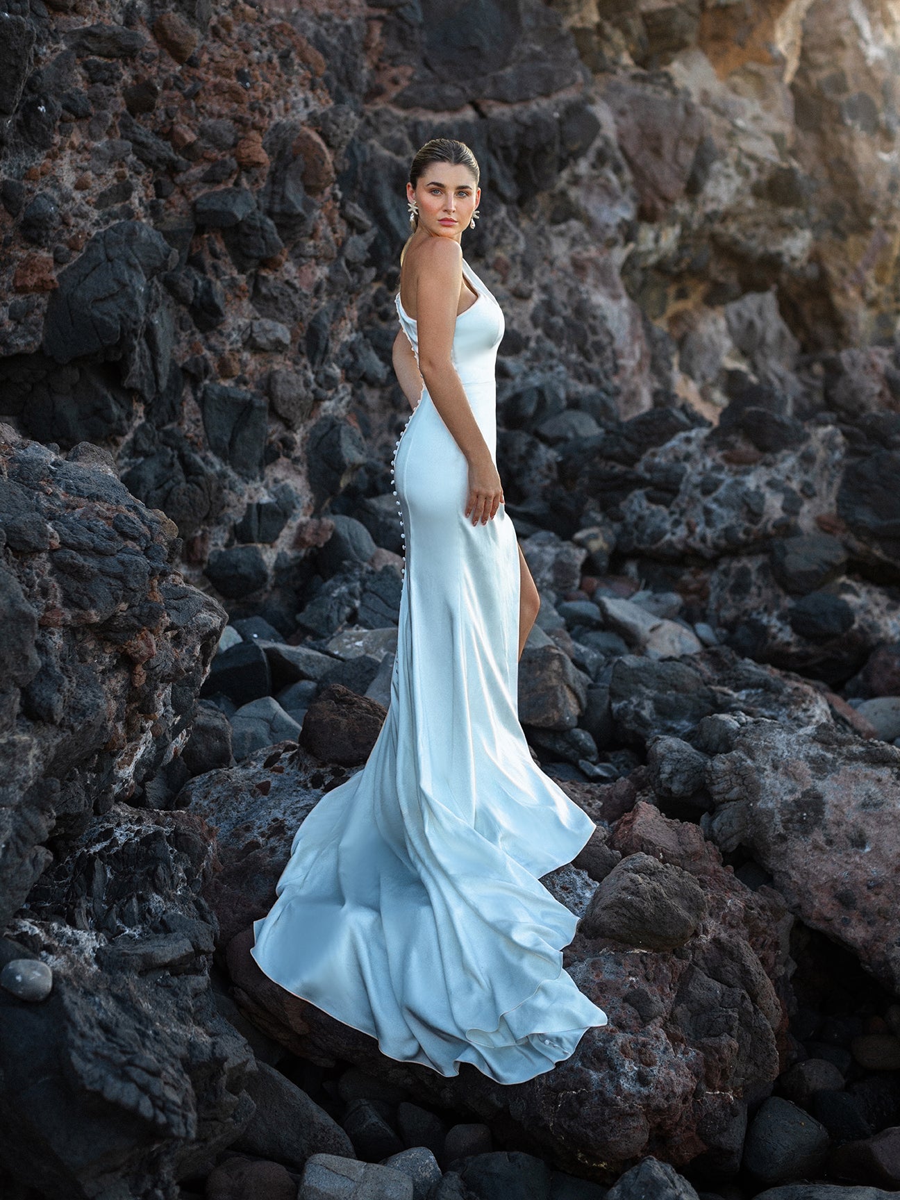 Serena is a sleek satin sheath gown featuring a one-shoulder design with elegant pleating and a subtle slit for movement. Satin-covered buttons trail down the back, adding a classic touch, while the included matching scarf offers versatile styling options for a polished, modern bridal l... Read More