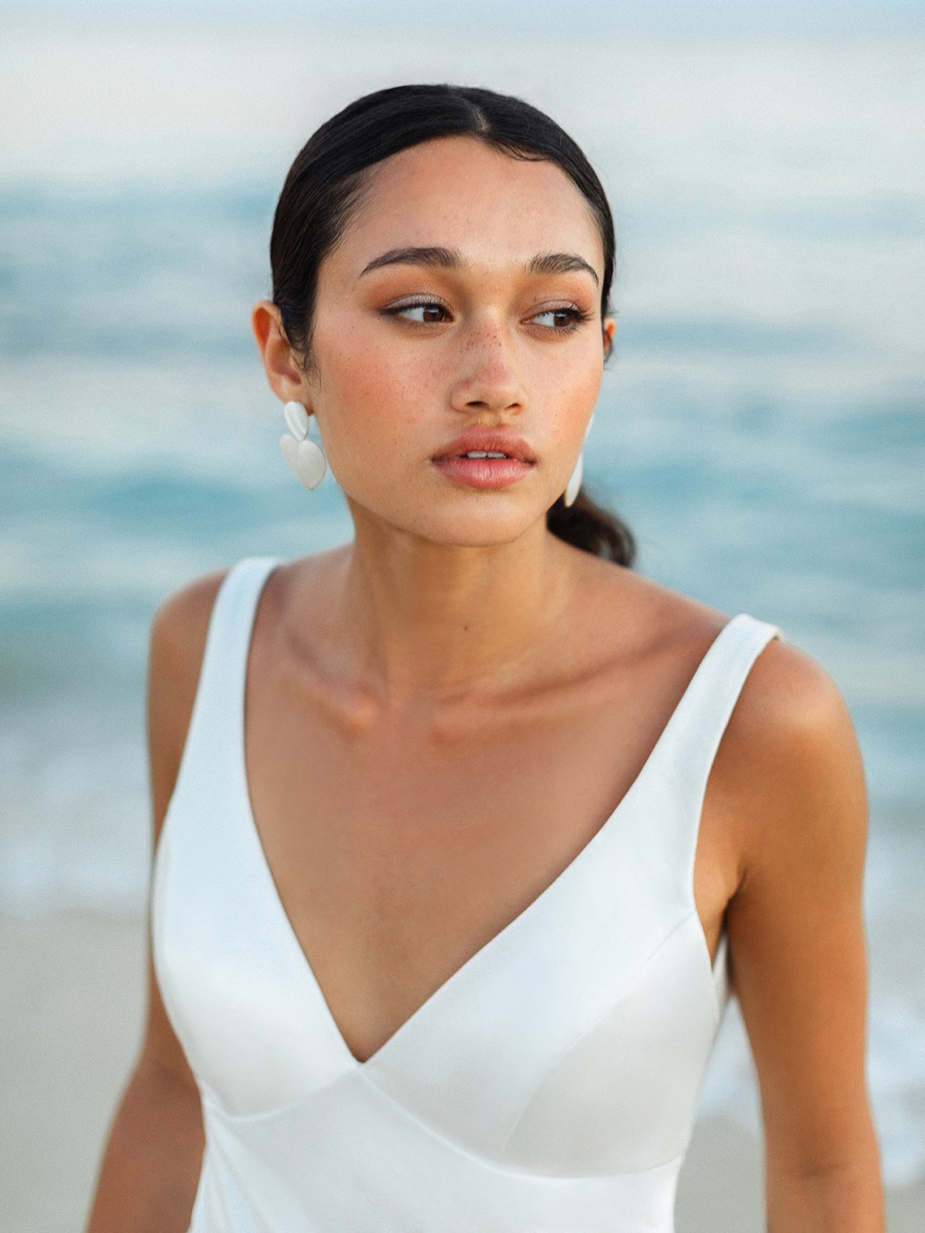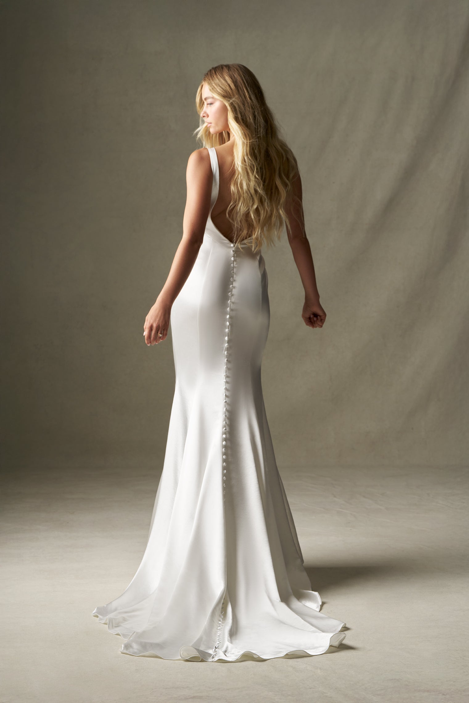 Azul is a stunning liquid satin sheath wedding gown designed for modern brides seeking elegance and sophistication. Featuring a flattering V-neckline with delicate straps, a low back adorned with satin-covered buttons, and a graceful sweep train, this bridal dress exudes timeless beauty... Read More
