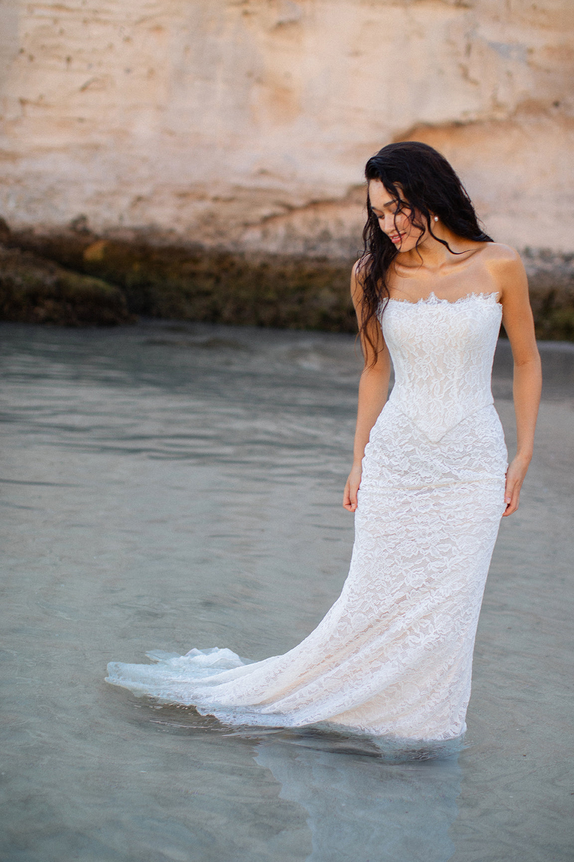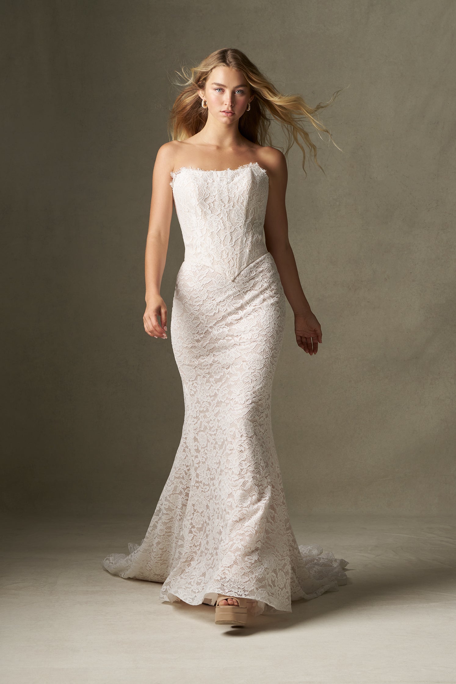 The Perla skirt is crafted from the same classic lace as the bodice, designed to sit at the natural waistline for a harmonious fit-and-flare silhouette. This seamless transition allows the bodice to rest perfectly on top, creating a cohesive, elegant look with soft movement and timeless bridal charm. Read Less