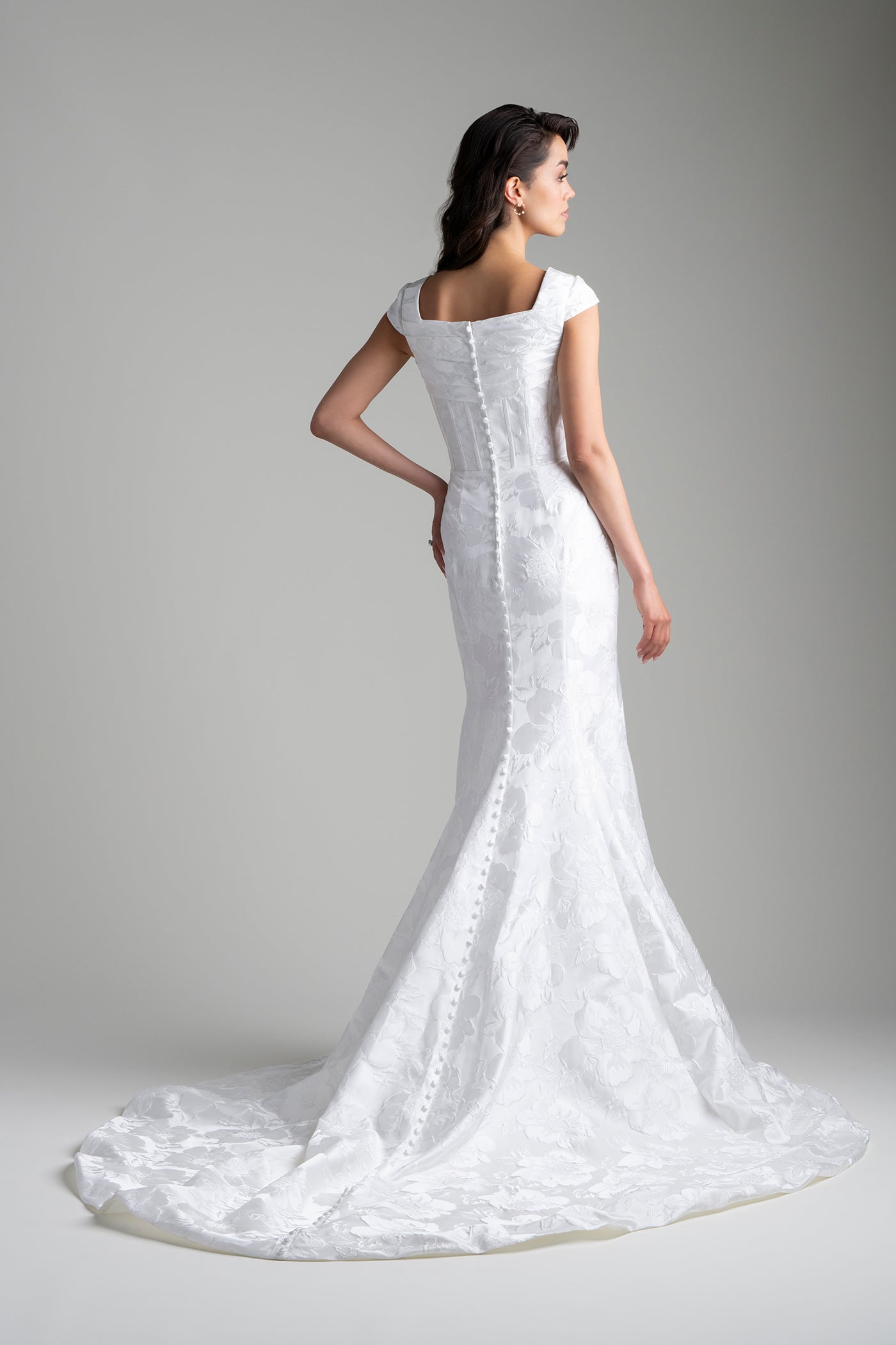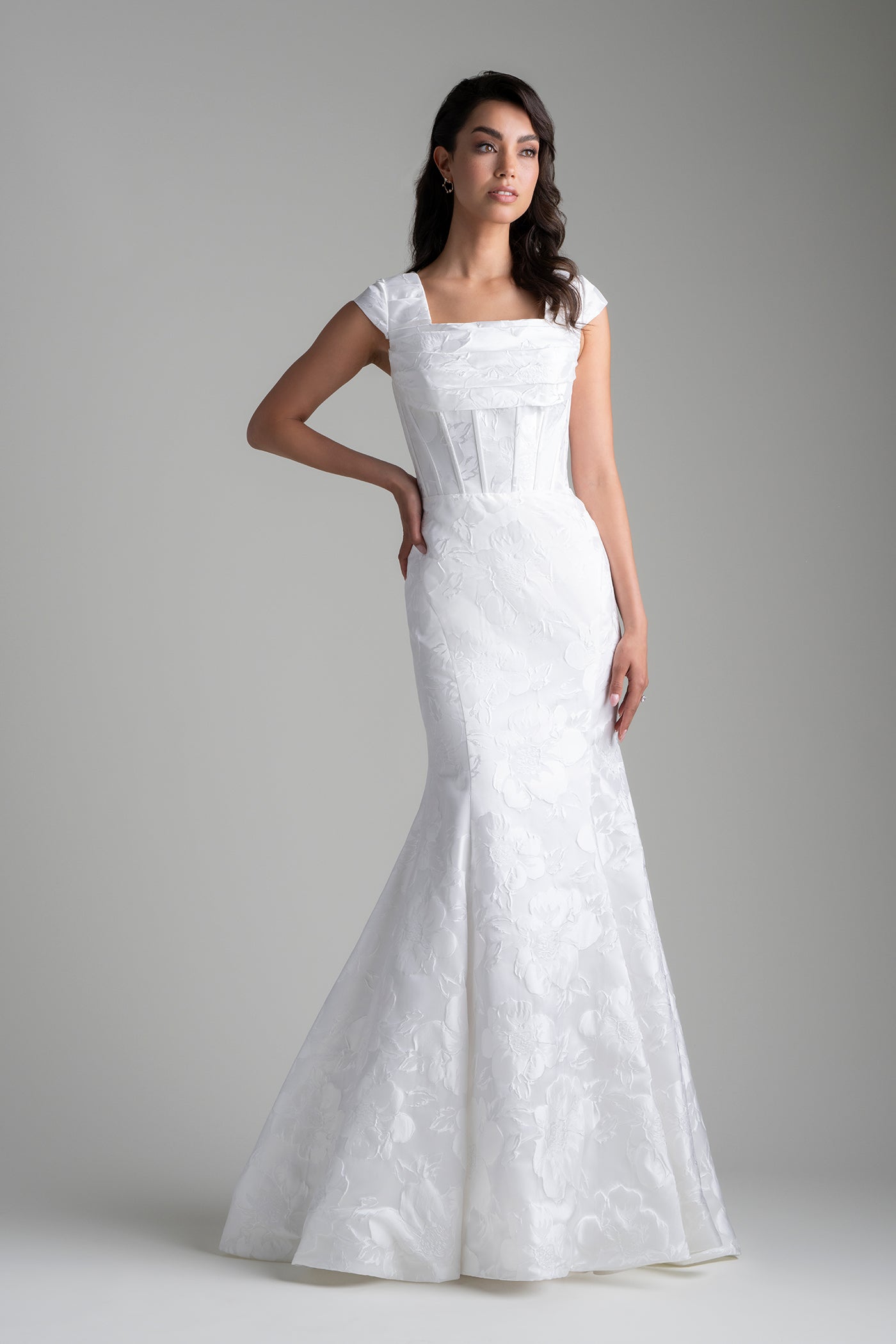 This fit and flare sheath gown features an elegant floral motif, along with boning and pleating along the cap sleeved bodice.