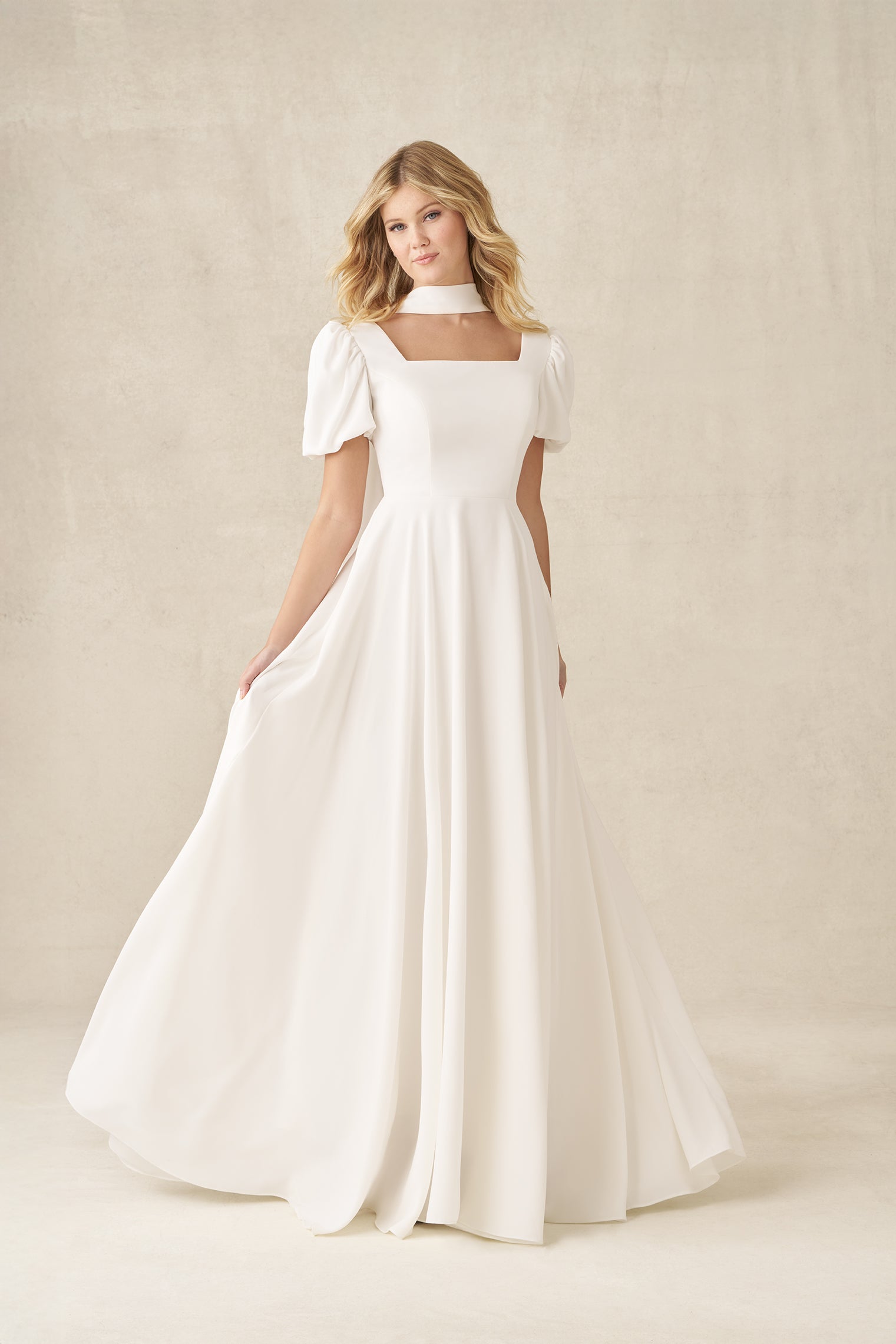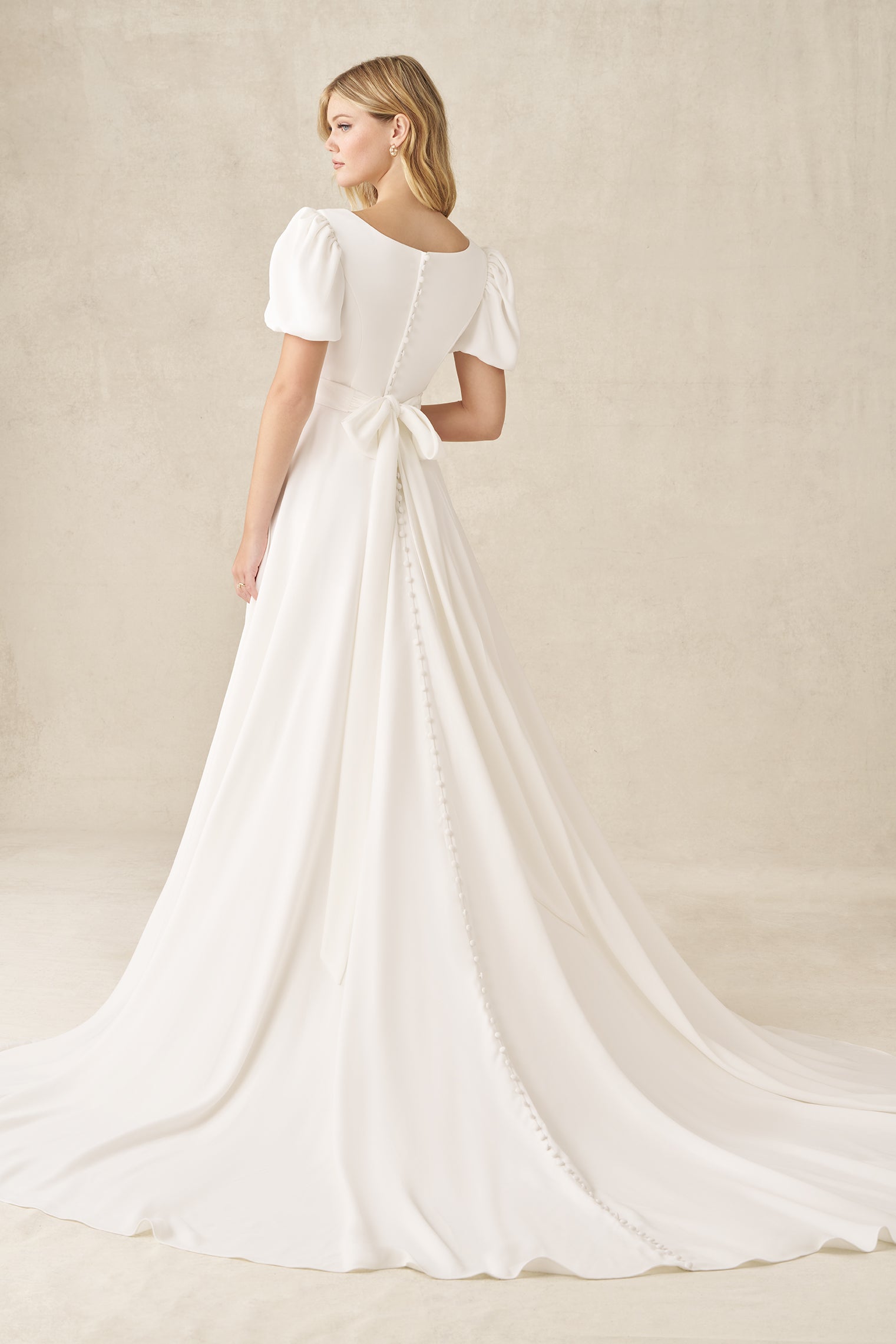 Elegant and modest, this A-line crepe gown features a square neckline with short puff sleeves and a high back finished with buttons down the train. A versatile crepe sash can be tied into a bow at the back or styled in other ways, adding a personalized touch to the refined silhouette.