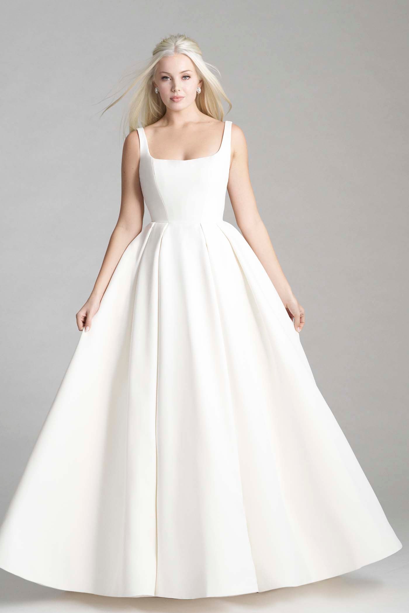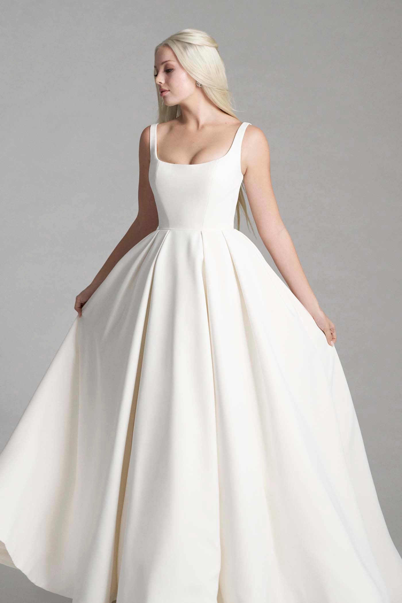 In this variation of Ellington, the silhouette is reimagined in buttery dove satin for a smoother, more fluid finish. The scoop neckline and wide straps remain, offering clean support through the bodice, while the pleated ballgown skirt flows from a cinched natural waist. Two minimal li... Read More