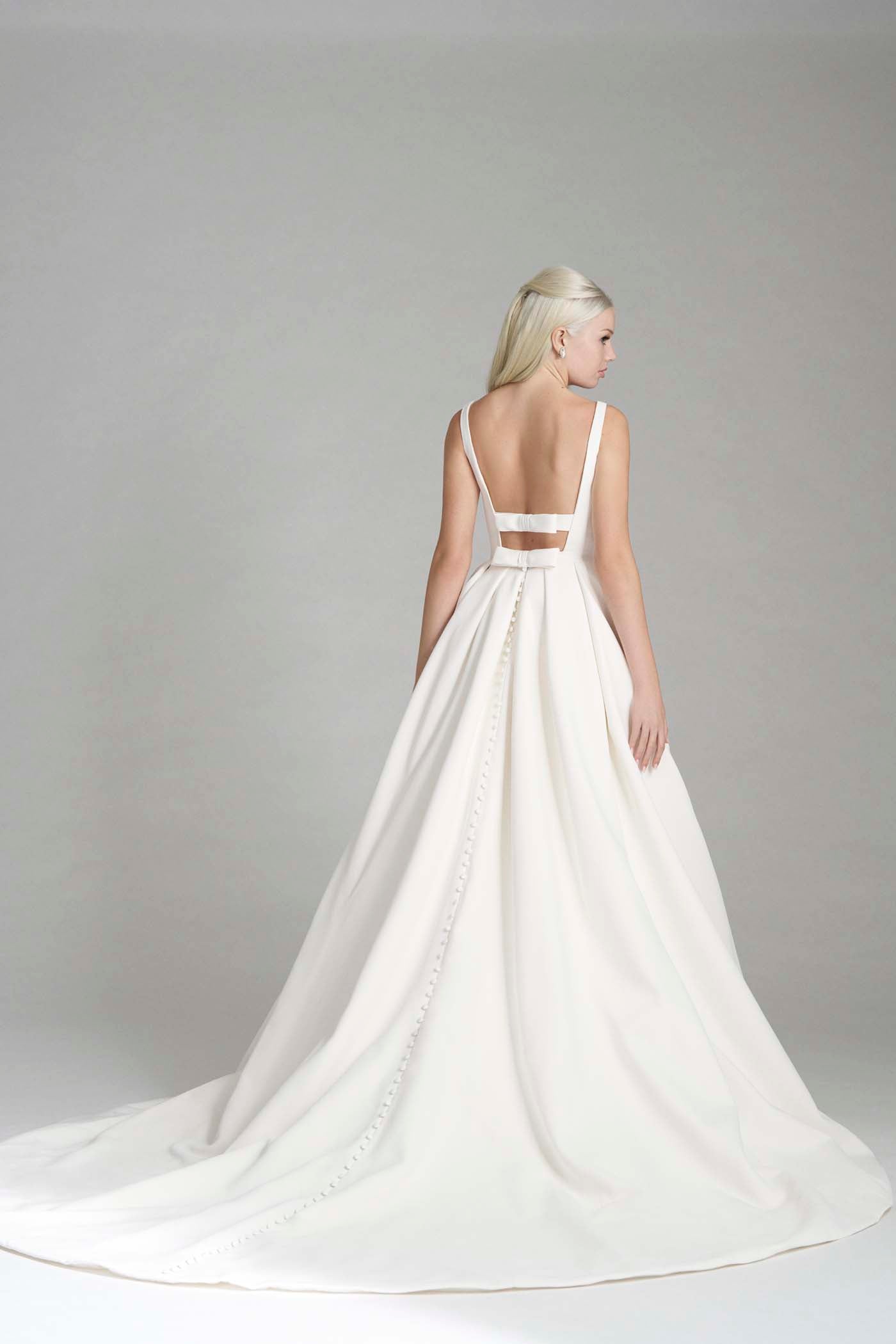 In this variation of Ellington, the silhouette is reimagined in buttery dove satin for a smoother, more fluid finish. The scoop neckline and wide straps remain, offering clean support through the bodice, while the pleated ballgown skirt flows from a cinched natural waist. Two minimal linear bows accent the plunging back, adding a tailored, architectural touch to this effortlessly modern gown. Read Less