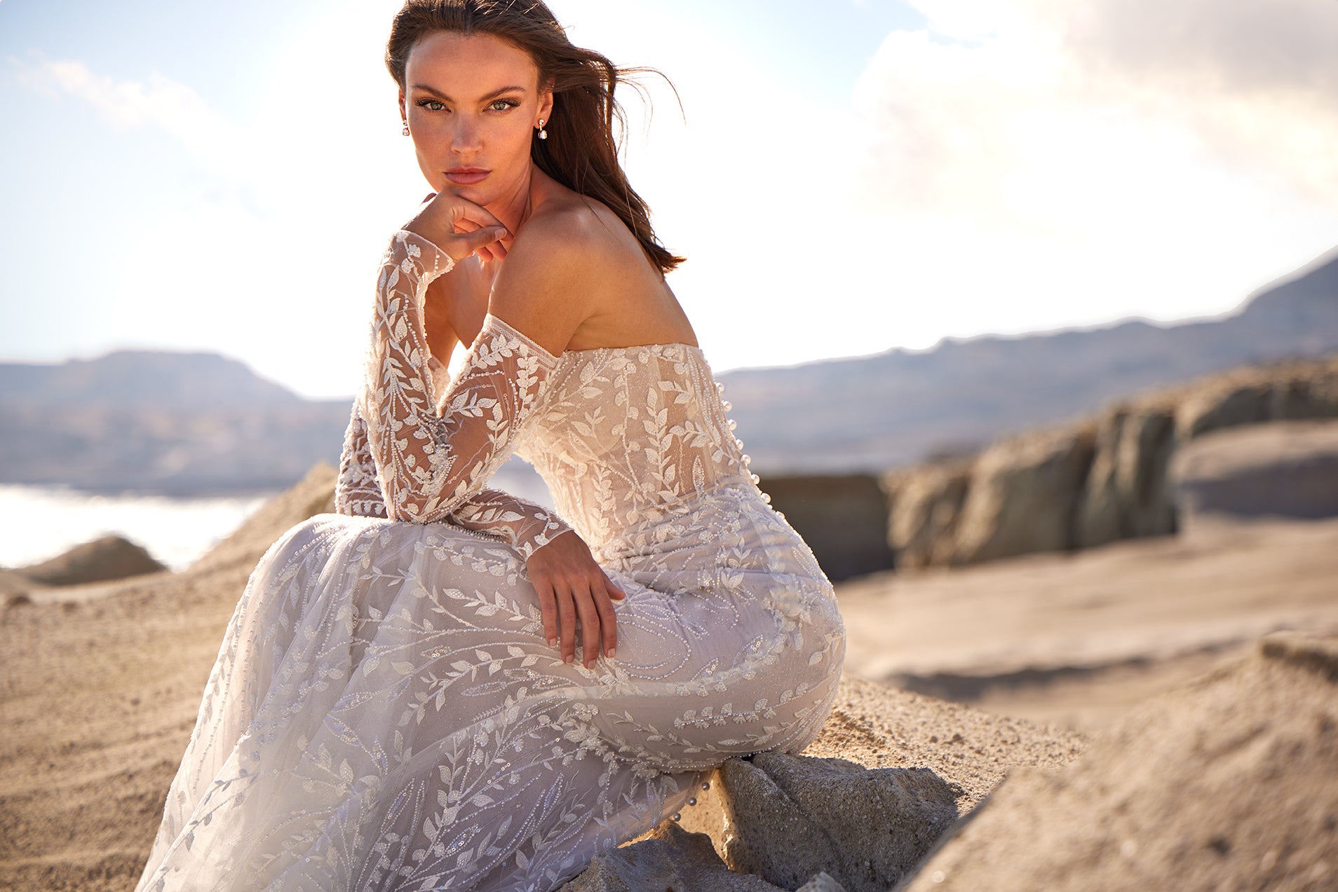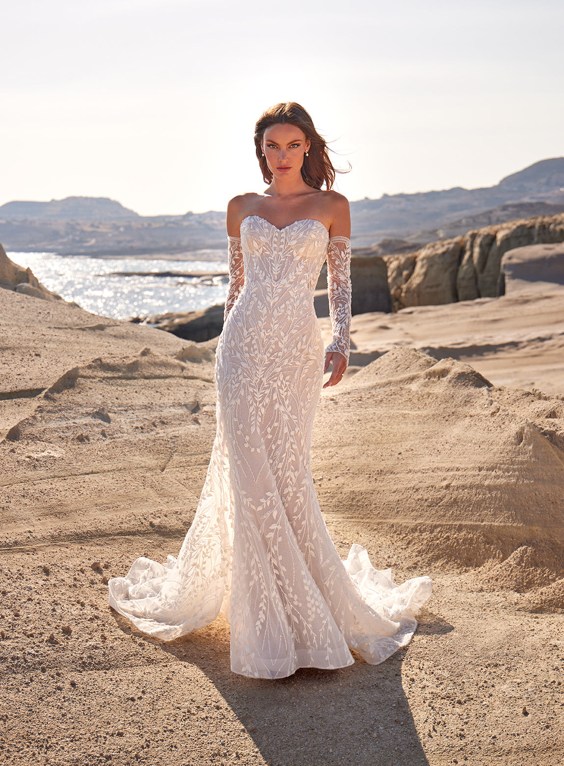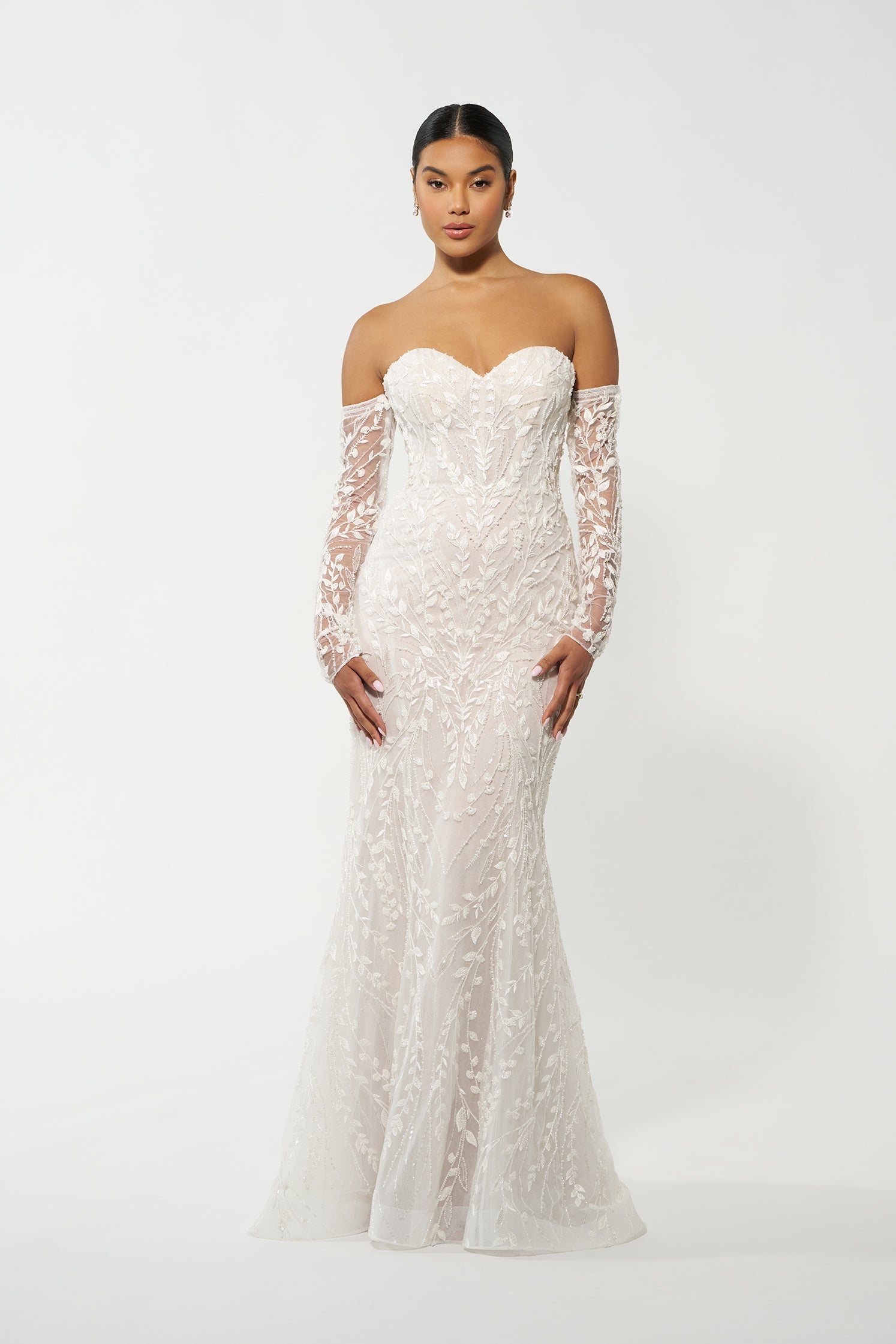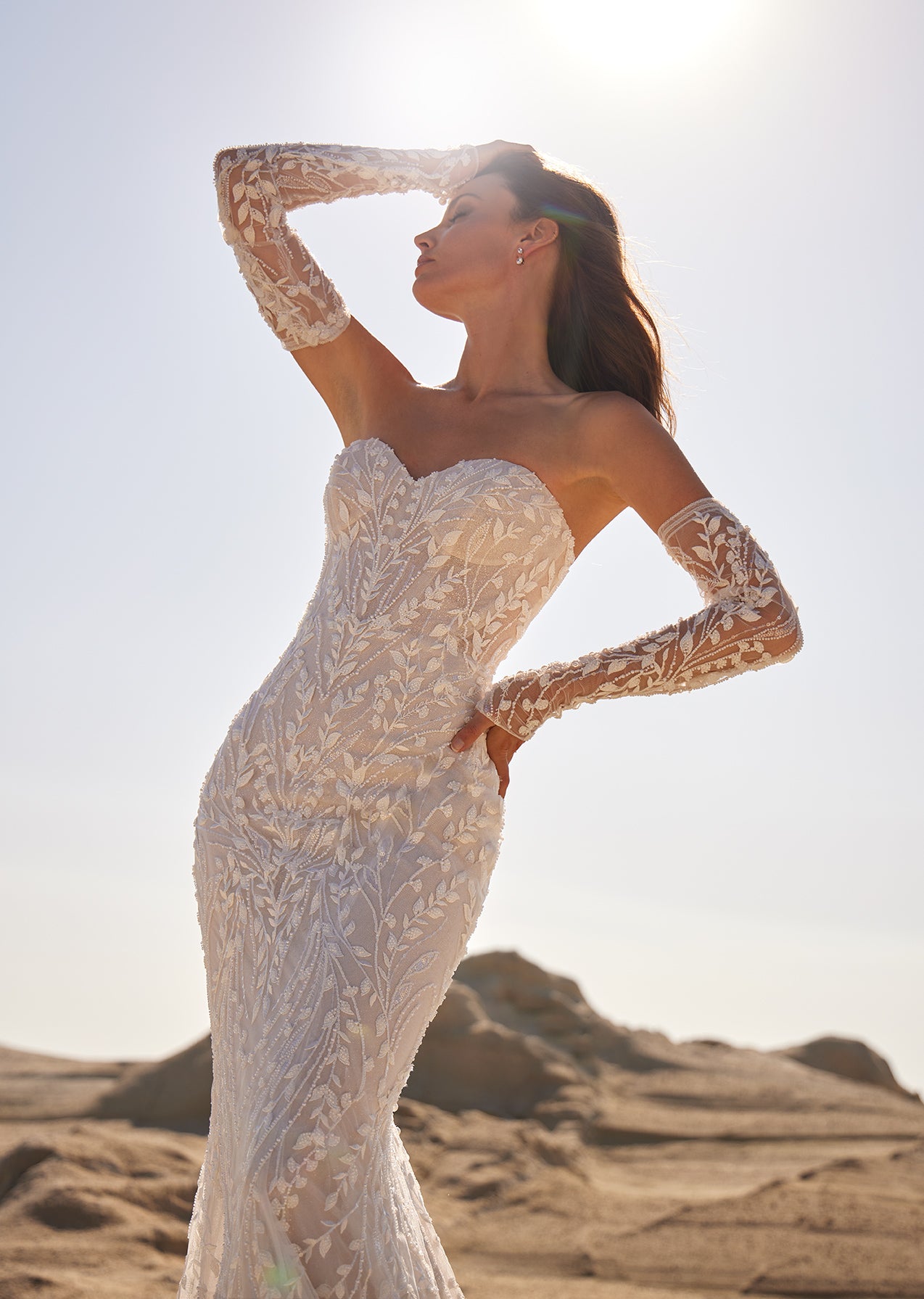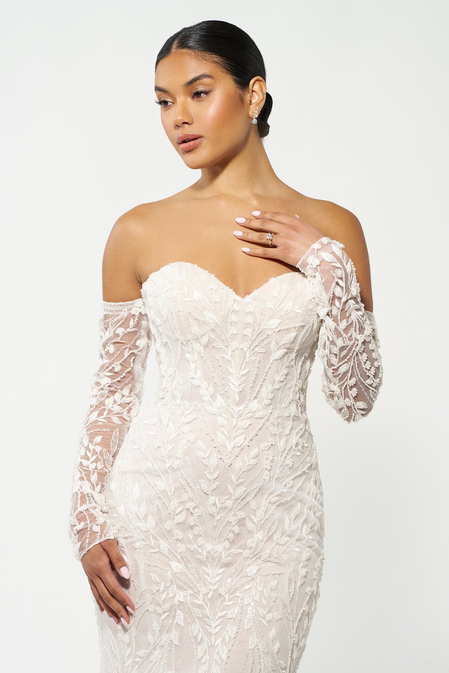 These detachable sleeves are the perfect complement to the Dakotah gown. Made from soft tulle with matching leafy lace and tonal beading, they add a romantic, elegant touch. Lightweight and versatile, they can be easily added or removed for a seamless transition from ceremony to reception.
