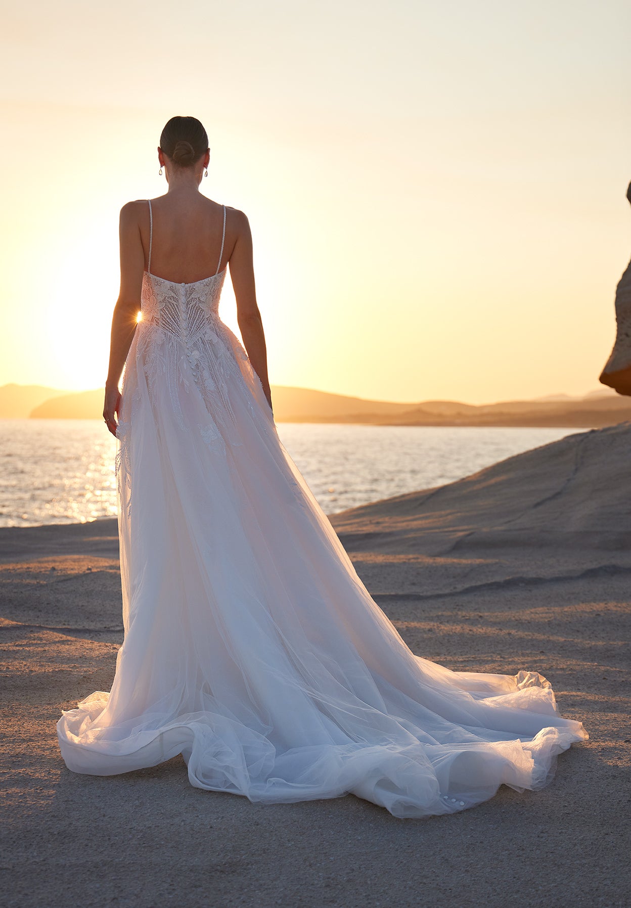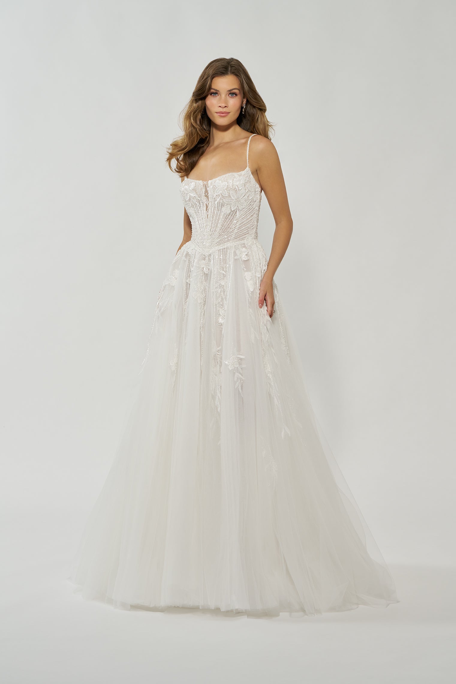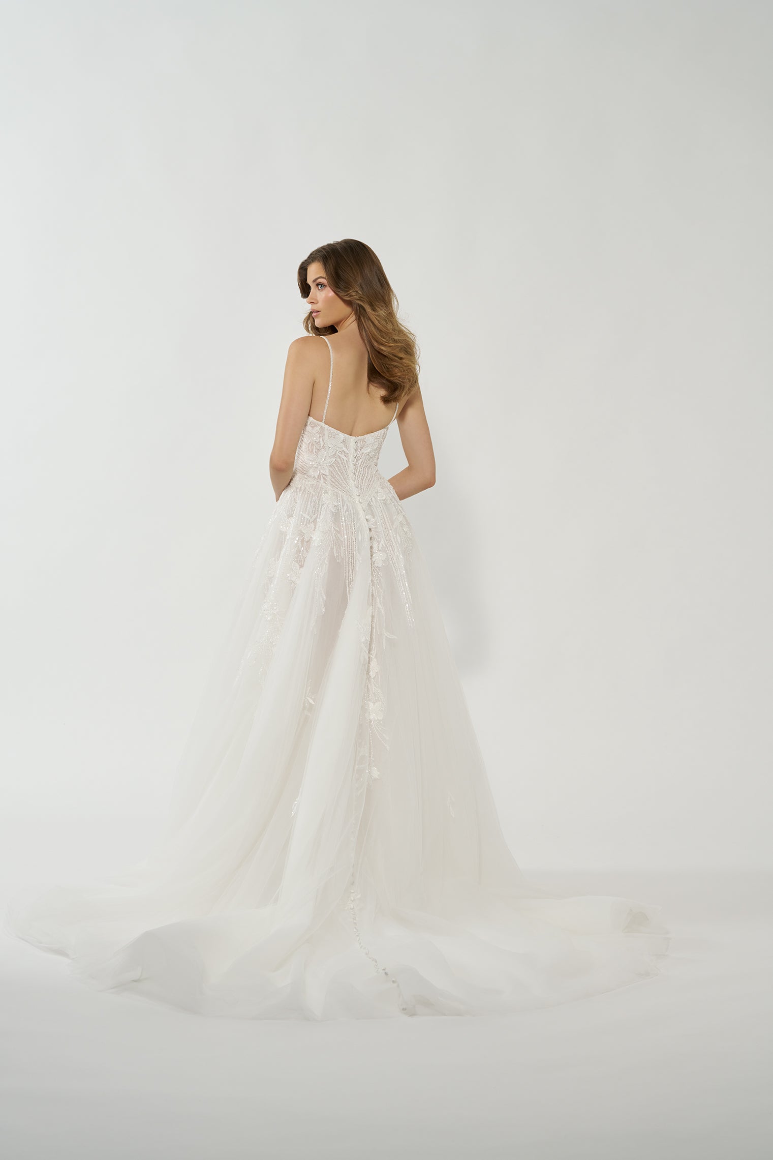 The Dylan gown is a romantic A-line silhouette crafted from soft tulle, subtly sheer to reveal delicate layers beneath. Floral lace, sparkling sequins, and intricate beading adorn the bodice and skirt, catching the light with every movement. A scoop neckline and spaghetti straps frame the shoulders gracefully, while a defined Basque waist enhances the figure for a dreamy, ethereal bridal look. Read Less
