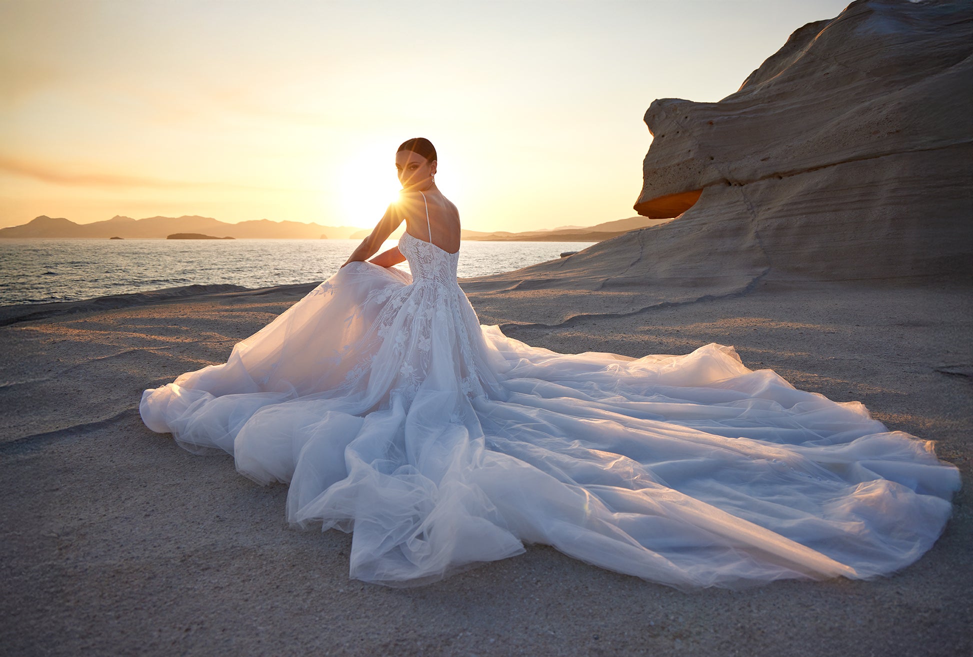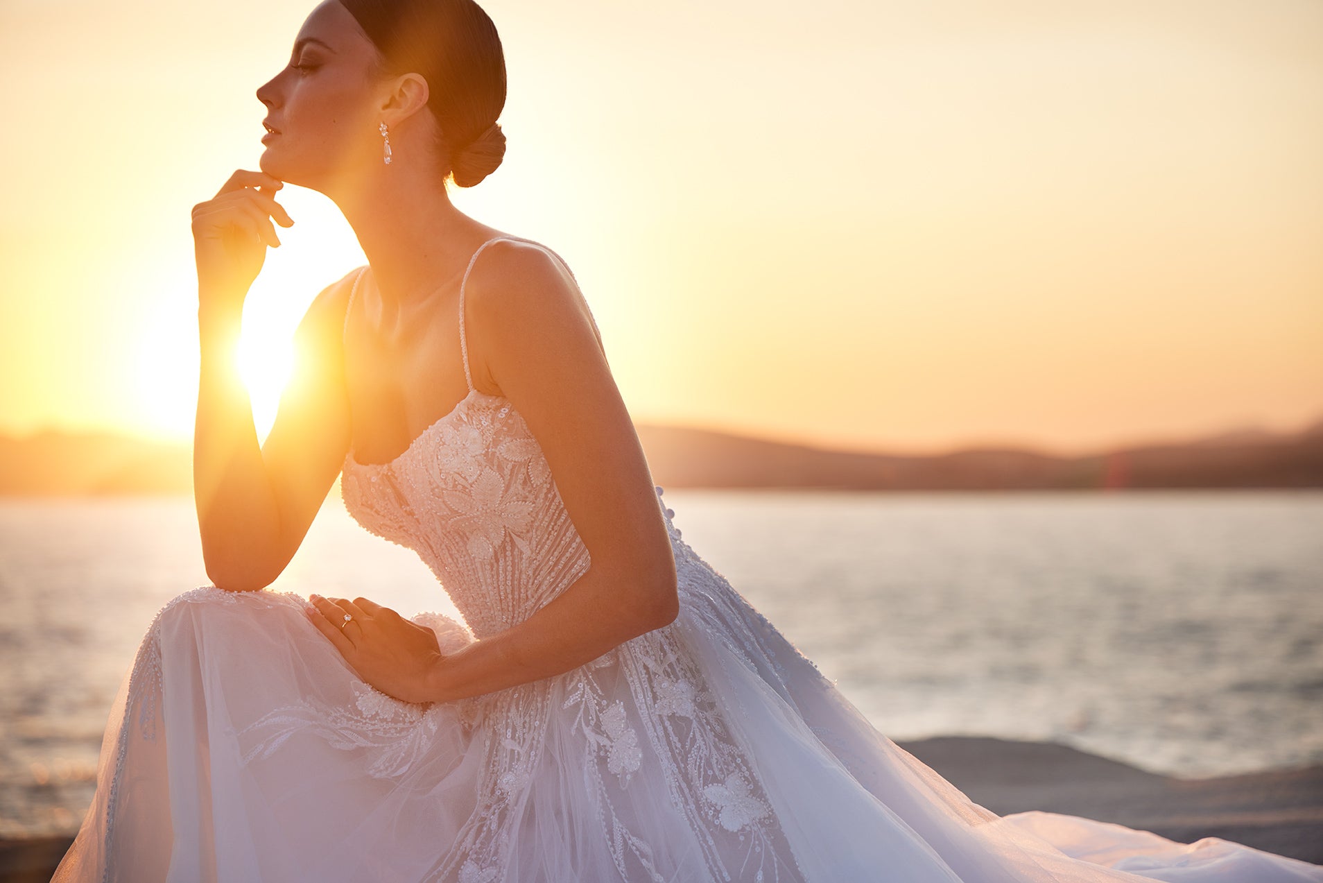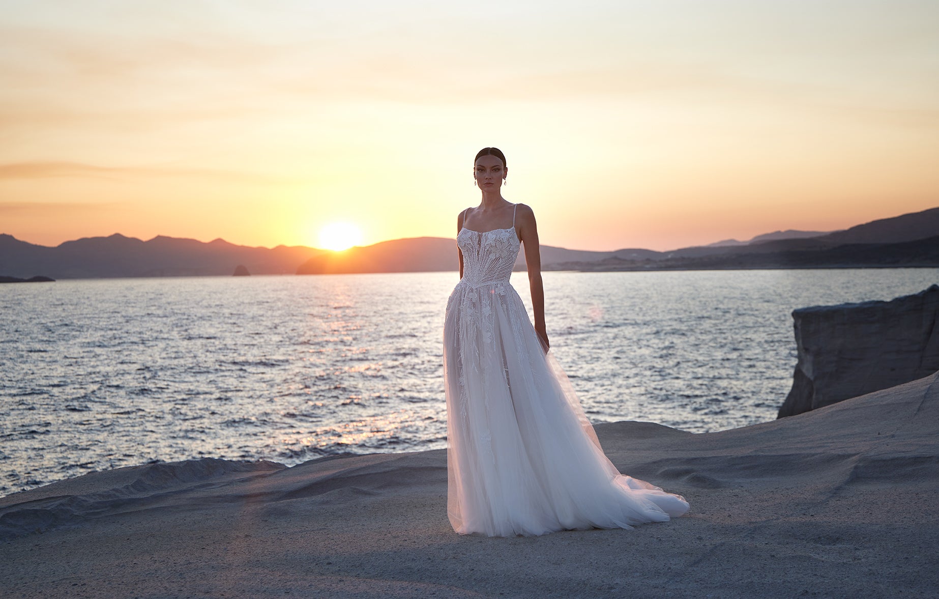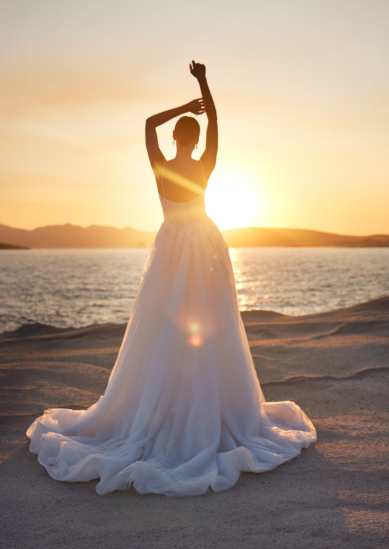 The Dylan gown is a romantic A-line silhouette crafted from soft tulle, subtly sheer to reveal delicate layers beneath. Floral lace, sparkling sequins, and intricate beading adorn the bodice and skirt, catching the light with every movement. A scoop neckline and spaghetti straps frame the shoulders gracefully, while a defined Basque waist enhances the figure for a dreamy, ethereal bridal look. Read Less