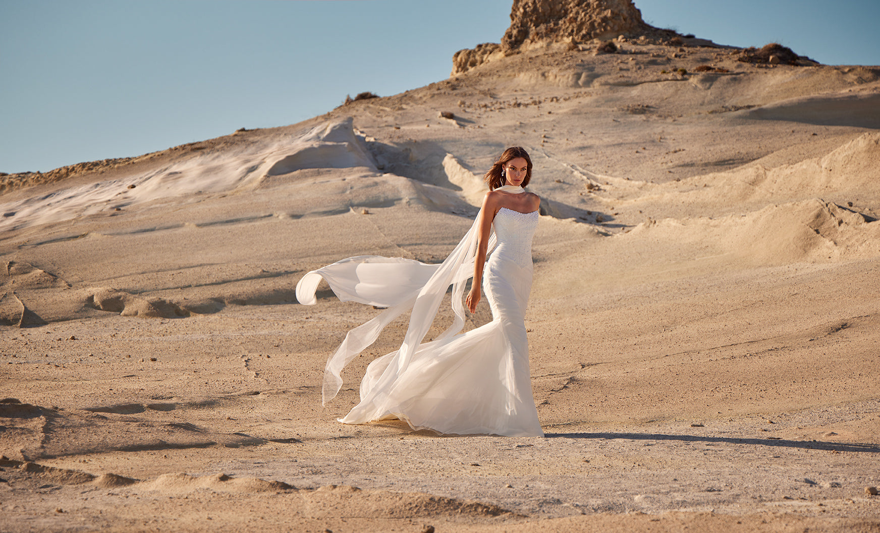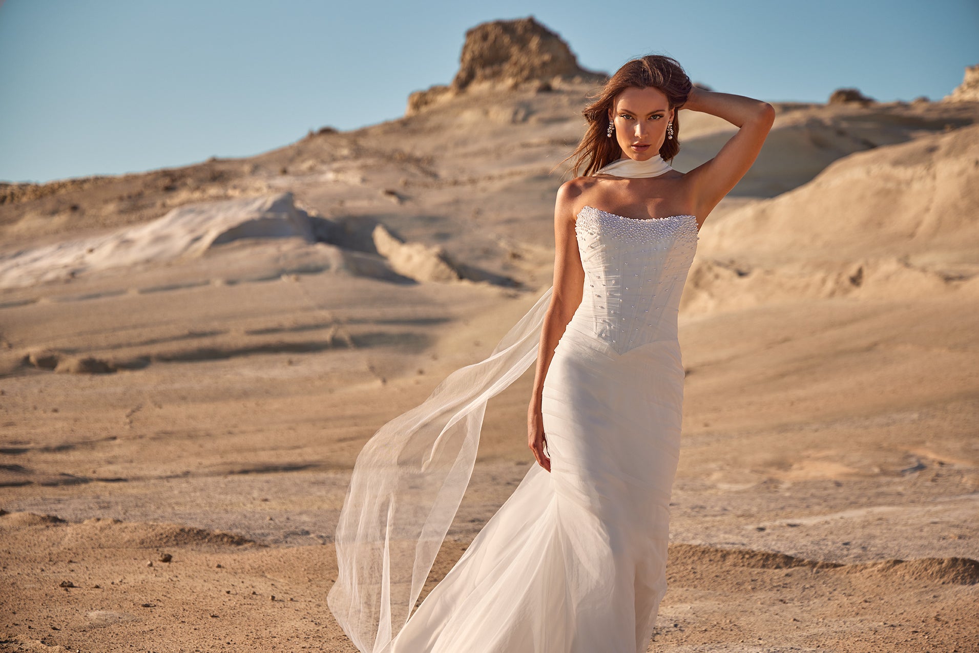 The Destiny gown offers a modern take on classic romance. This strapless sheath features a soft crepe base with a ruched tulle overlay that adds dimension and texture. The scoop-cateye neckline and pearl-adorned bodice create an elegant focal point, while the basque waist subtly defines the silhouette. Completing the look, a chic matching neck scarf adds a fresh, fashion-forward touch for the contemporary bride. Read Less