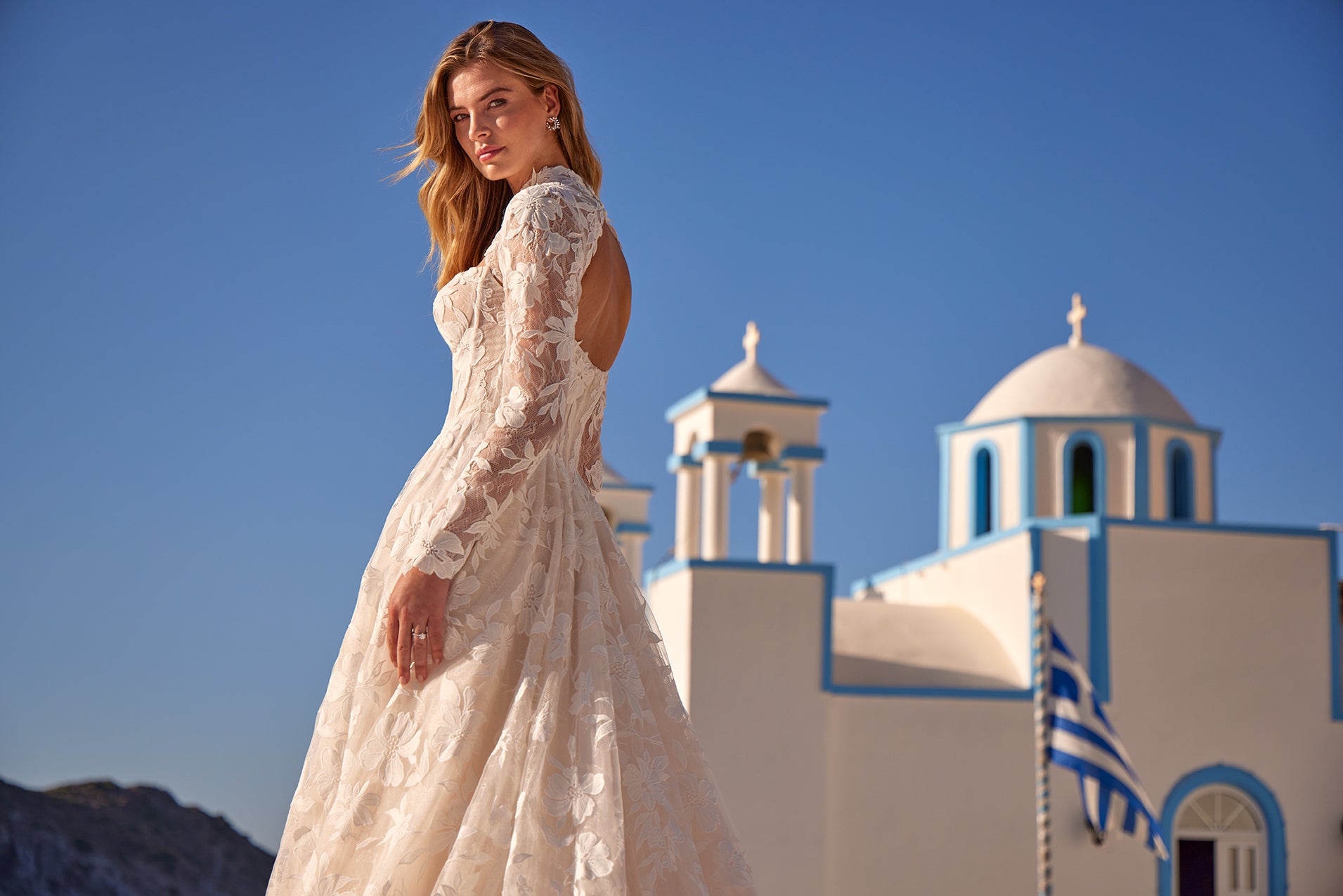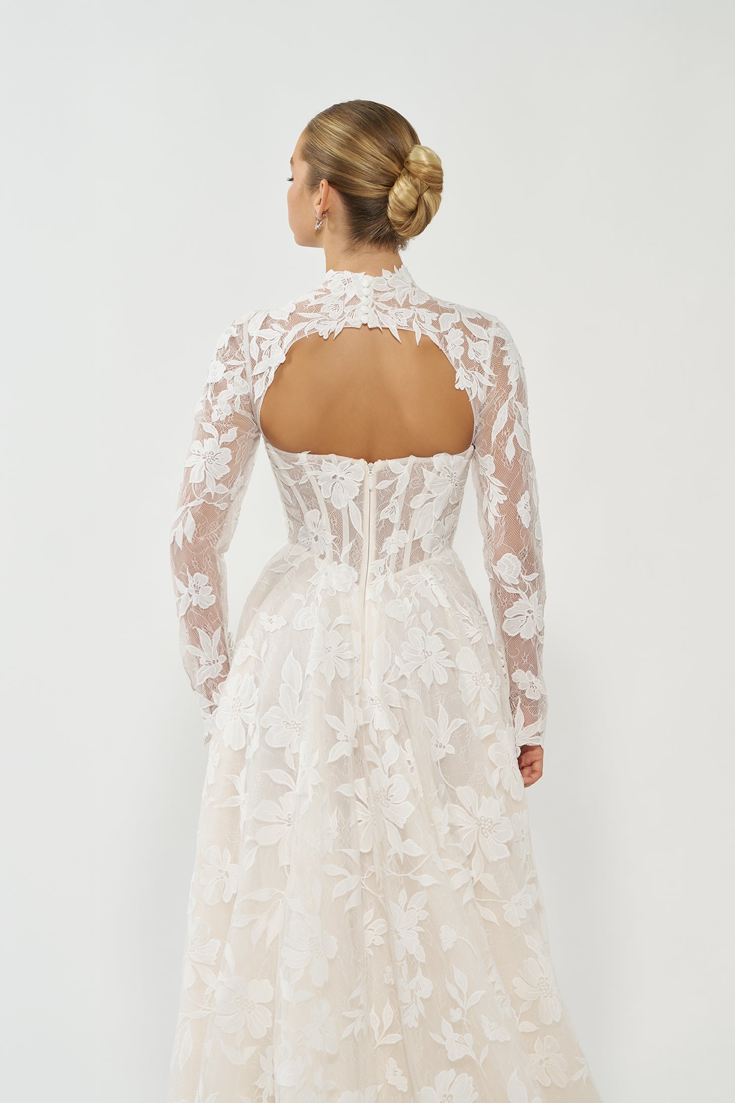 The Devin jacket is a romantic complement to the gown, crafted from soft tulle and adorned with matching lace appliques. Its long sleeves and delicate detailing create a cohesive, elevated look, adding texture and dimension to the ensemble while maintaining the gown’s graceful, timeless... Read More