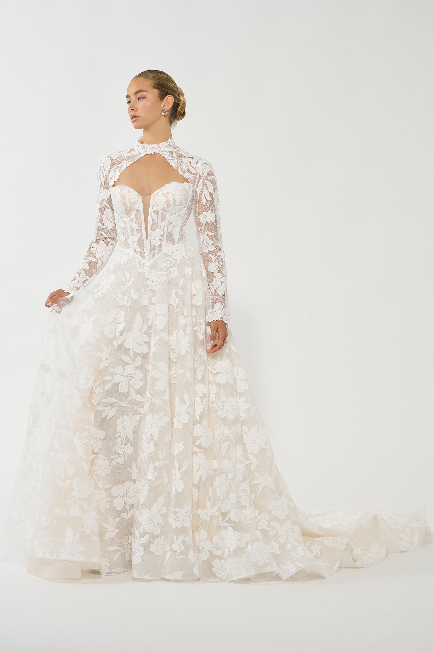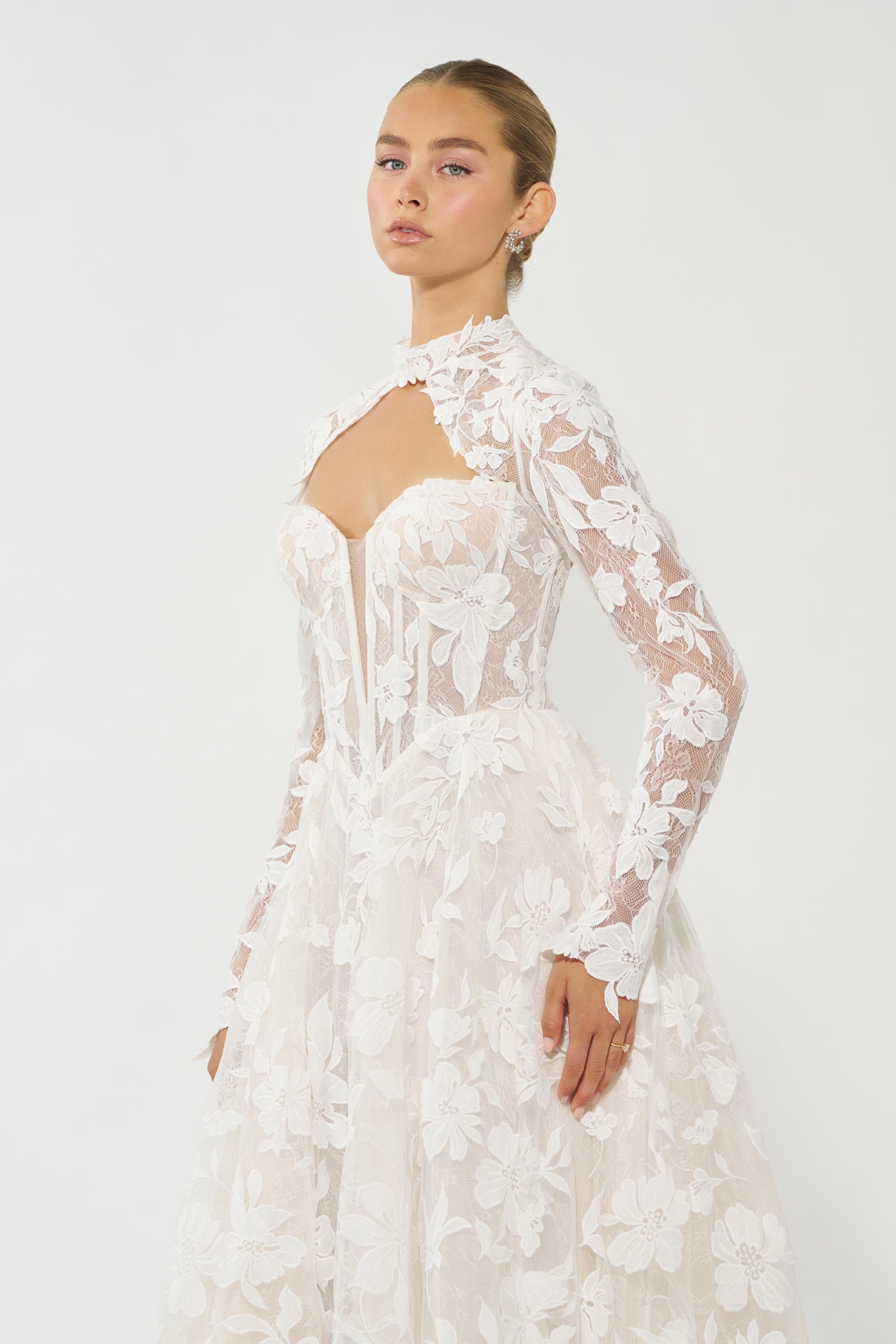 The Devin jacket is a romantic complement to the gown, crafted from soft tulle and adorned with matching lace appliques. Its long sleeves and delicate detailing create a cohesive, elevated look, adding texture and dimension to the ensemble while maintaining the gown’s graceful, timeless appeal. Read Less