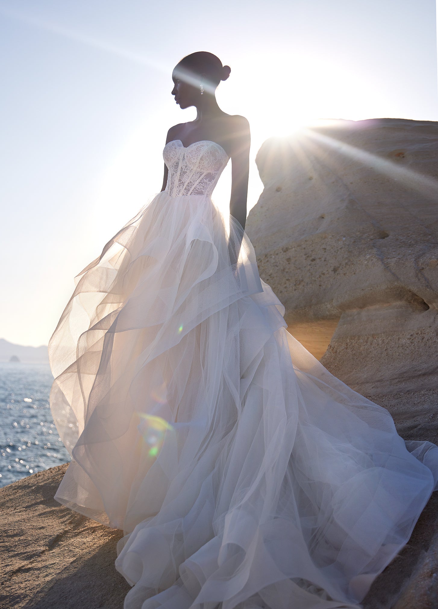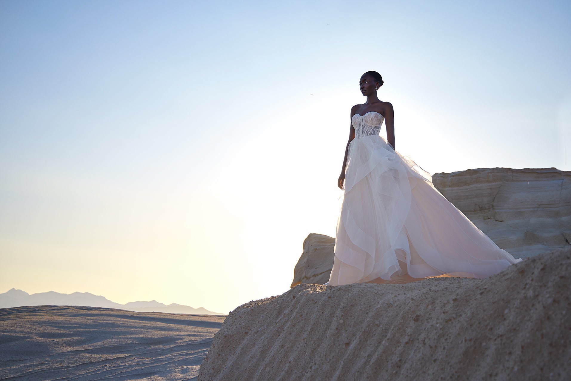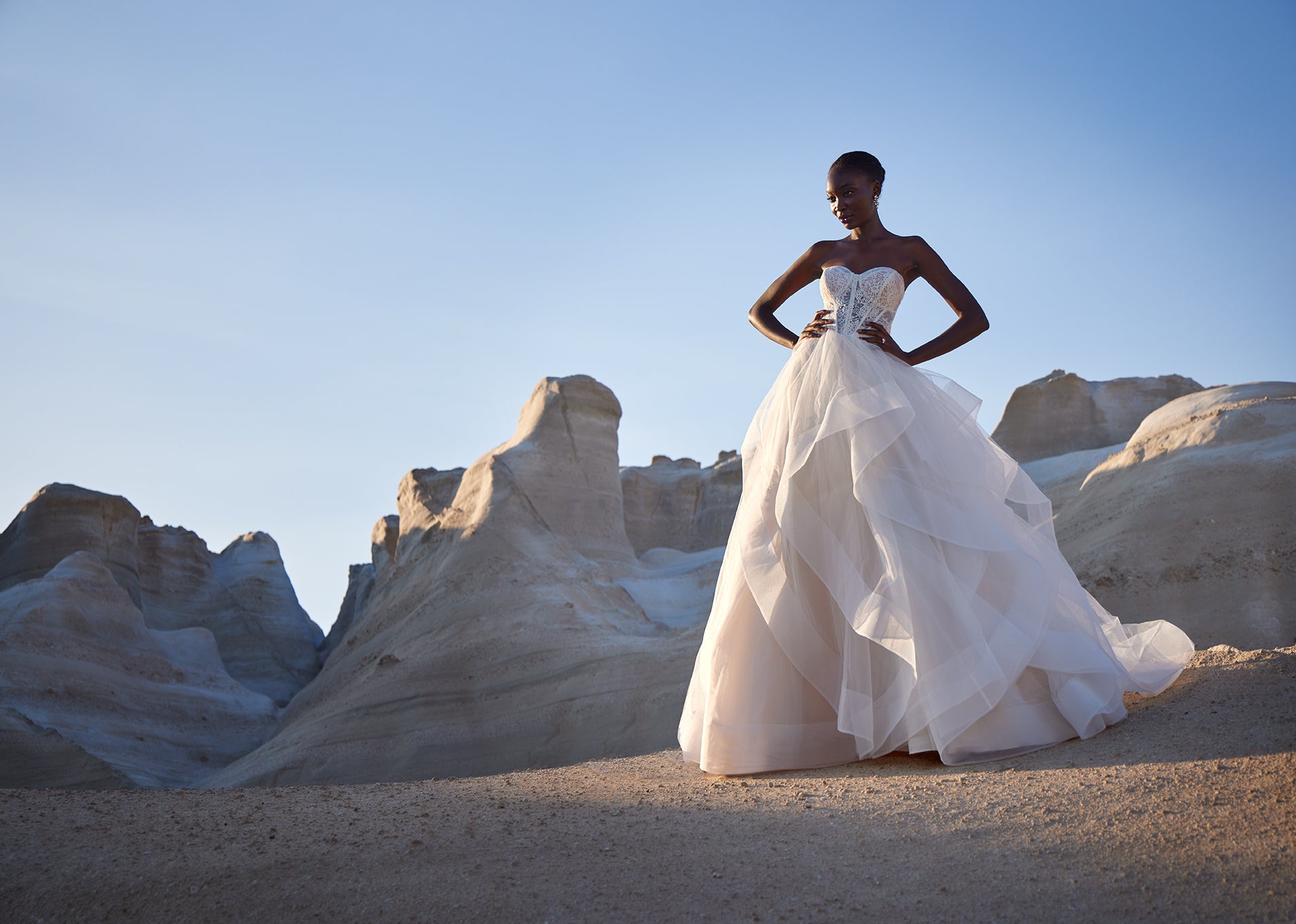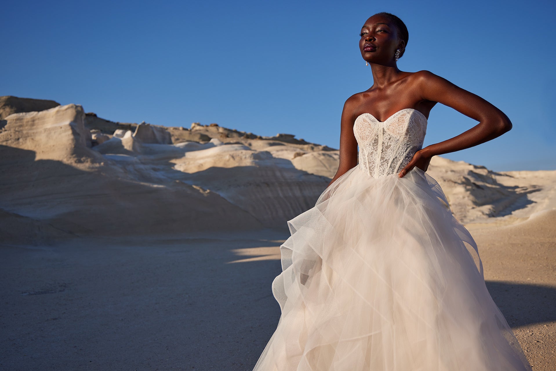 The Demi gown is a showstopping ballgown with a full tulle skirt, accented by ruffled layers defined with horsehair trim for volume and movement. Its sheer Chantilly lace bodice features corset-style boning and a romantic sweetheart neckline, while a basque waist enhances the silhouette... Read More