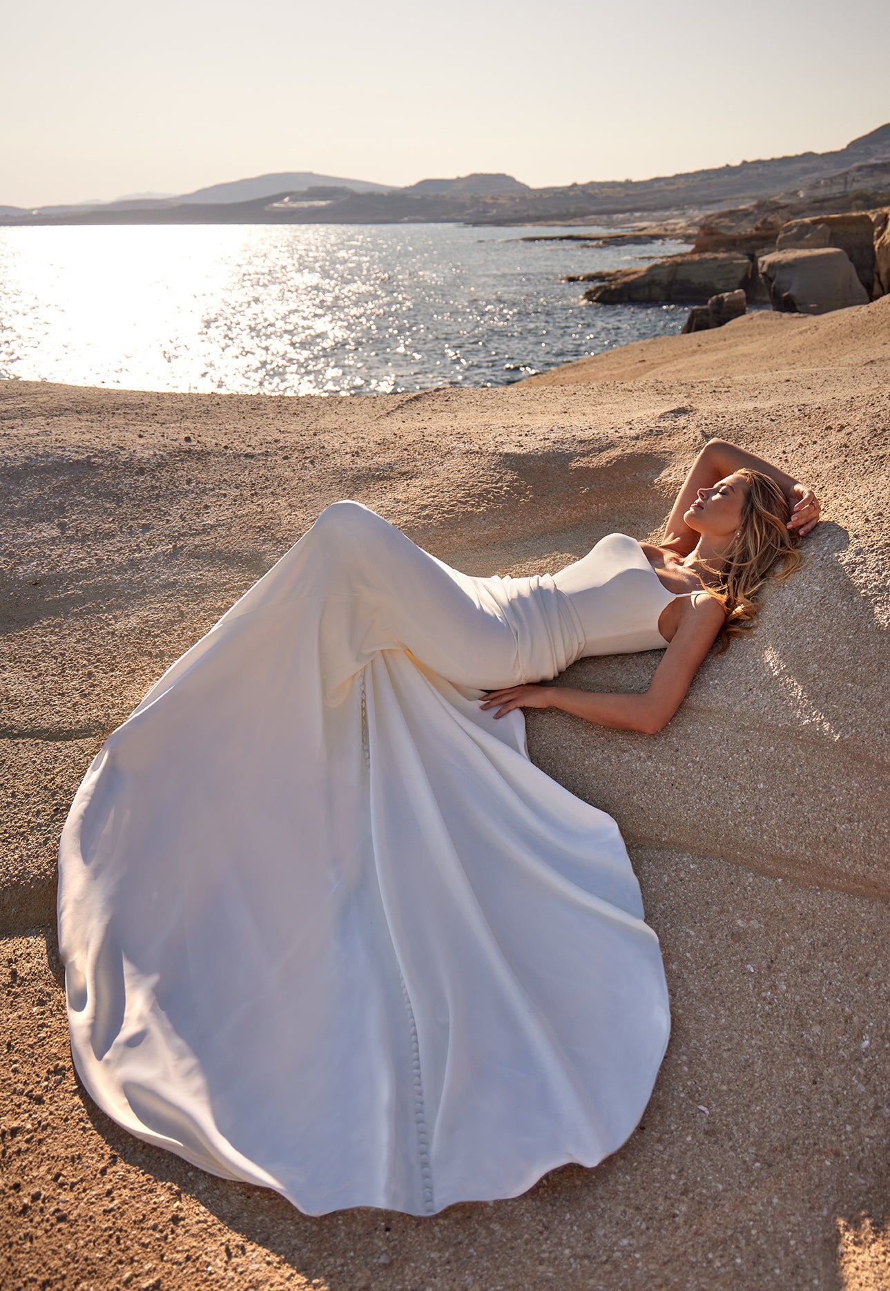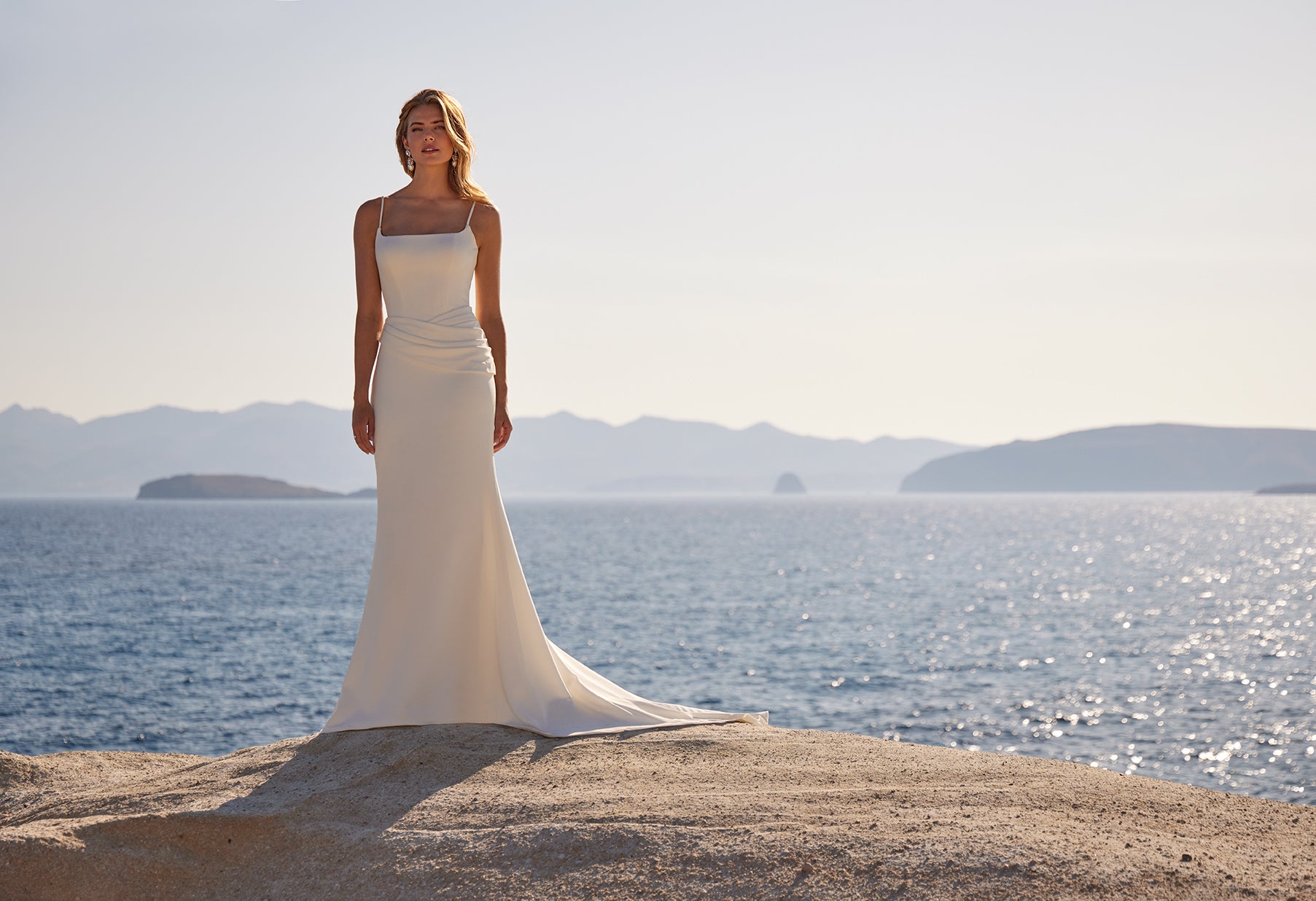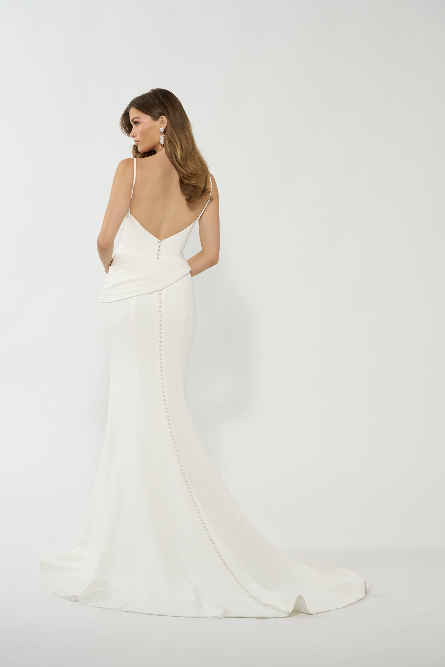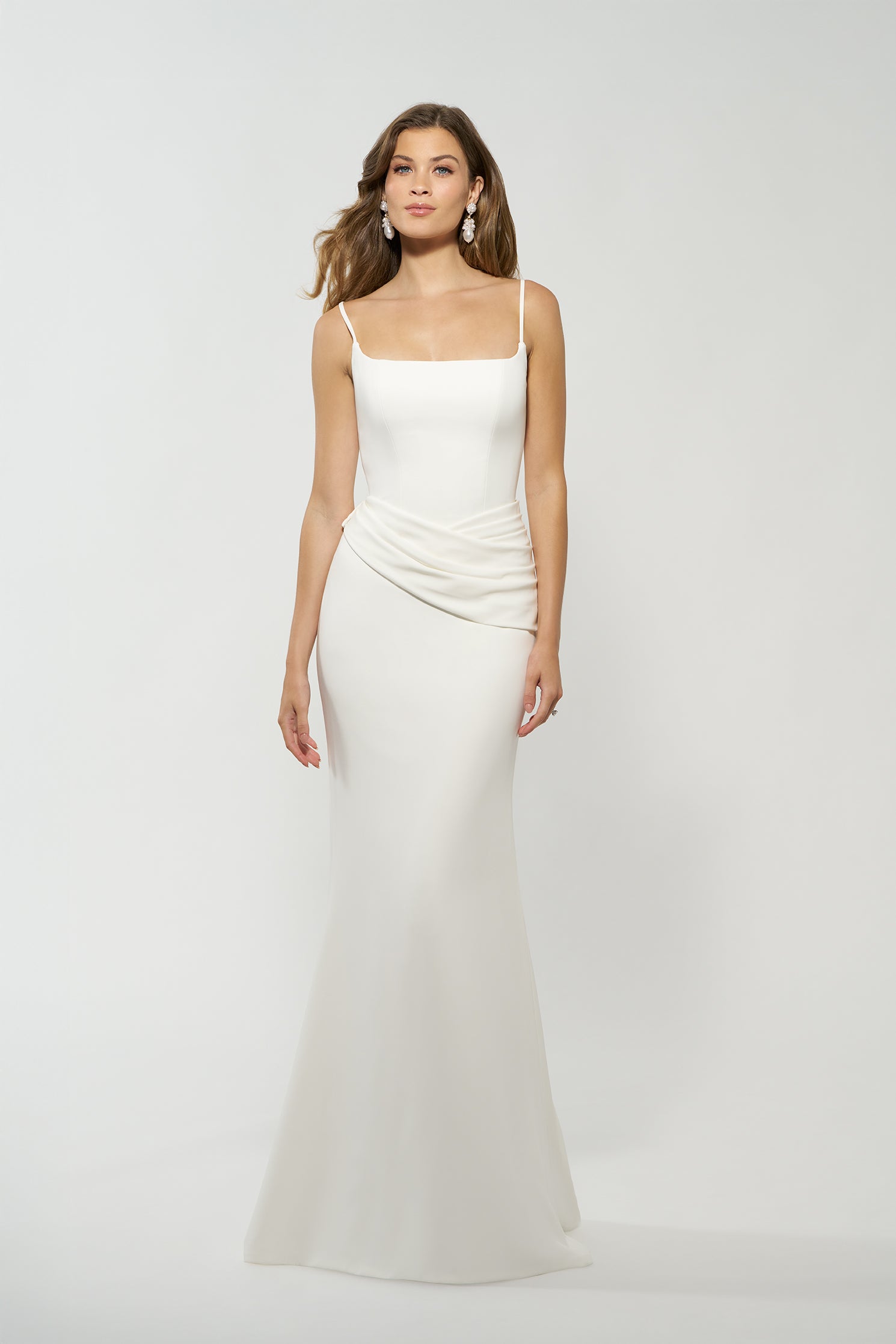 Clean and modern, Dani is a crepe sheath dress featuring a square neckline and delicate spaghetti straps. Minimalist in design, it is elevated by a ruched, sash detail around the waist and hips that subtly accentuates the natural waist, creating a sleek and sophisticated silhouette for the contemporary bride. Read Less