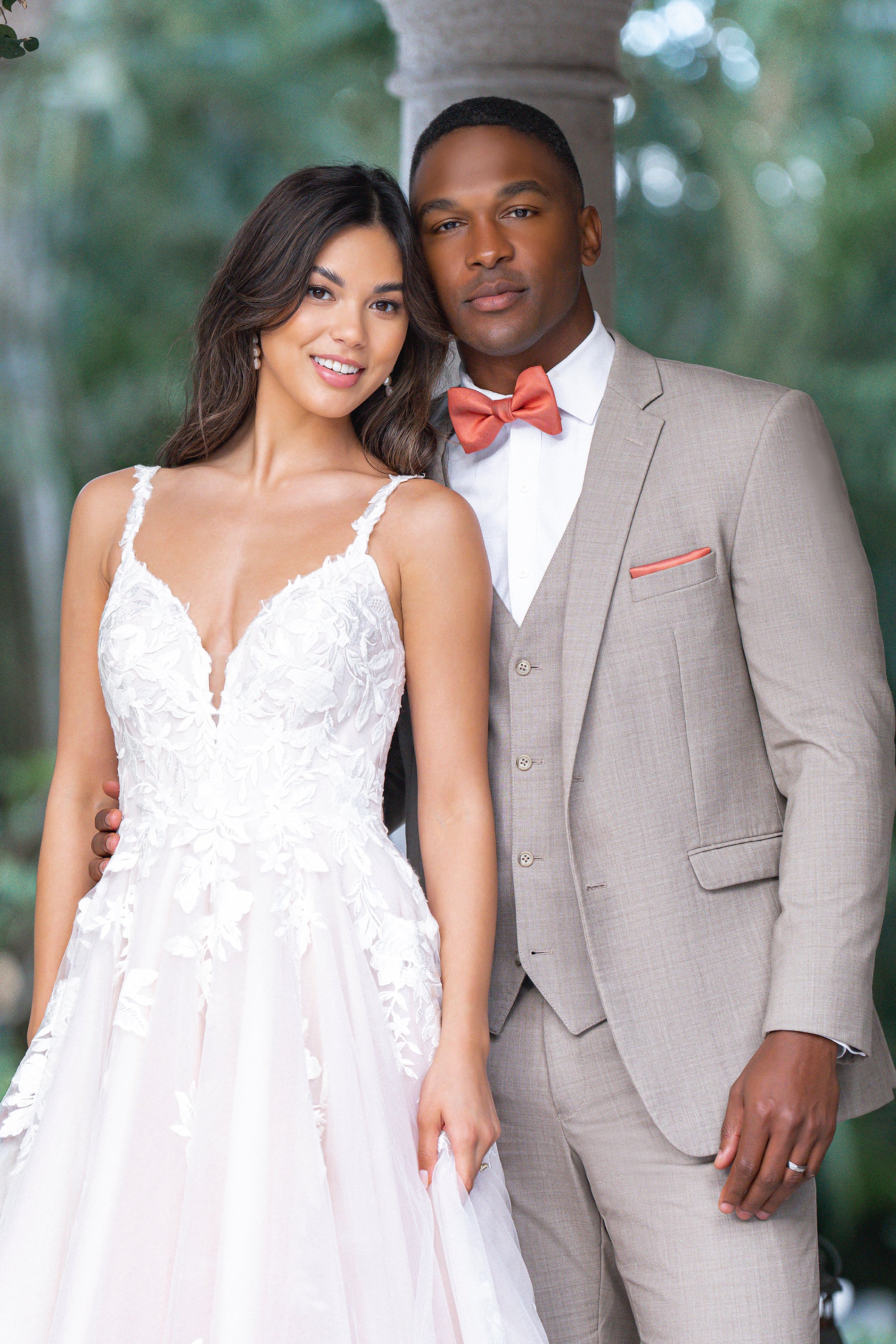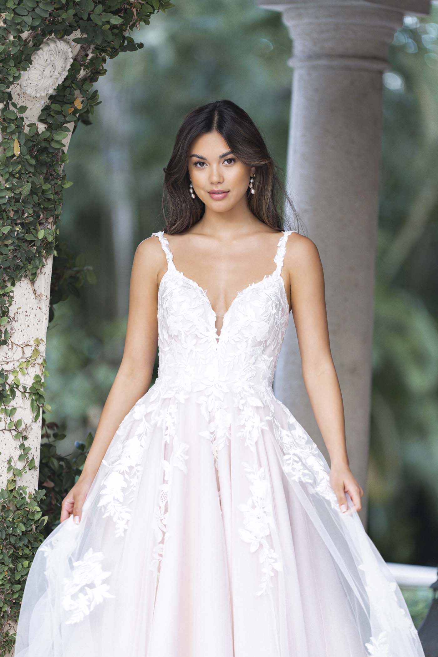 This soft A-line gown features a sweetheart neckline, slender straps, and a scoop back for a romantic, open finish. Matte lace appliques drift across layers of soft tulle, adding subtle texture to the airy silhouette. A natural waistline defines the fit, flowing into a graceful, floor-l... Read More