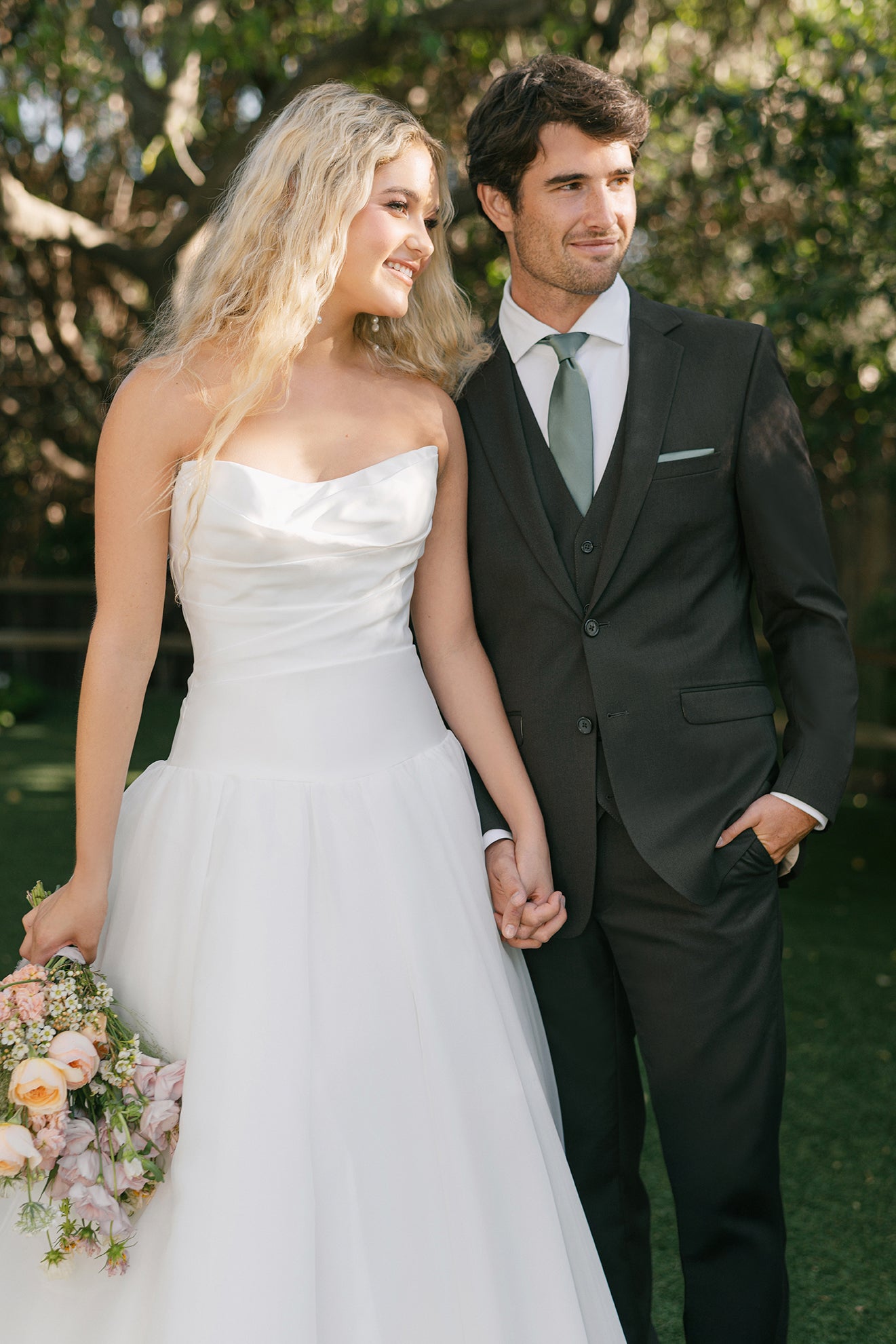 Classic and graceful, this A-line gown features a ruched satin bodice paired with a softly structured organza skirt. The scoop neckline and dropped waist create a flattering, elongated silhouette, blending timeless design with a light, romantic finish. Simple yet refined, this gown captures the effortless beauty that defines Allure Romance. Read Less
