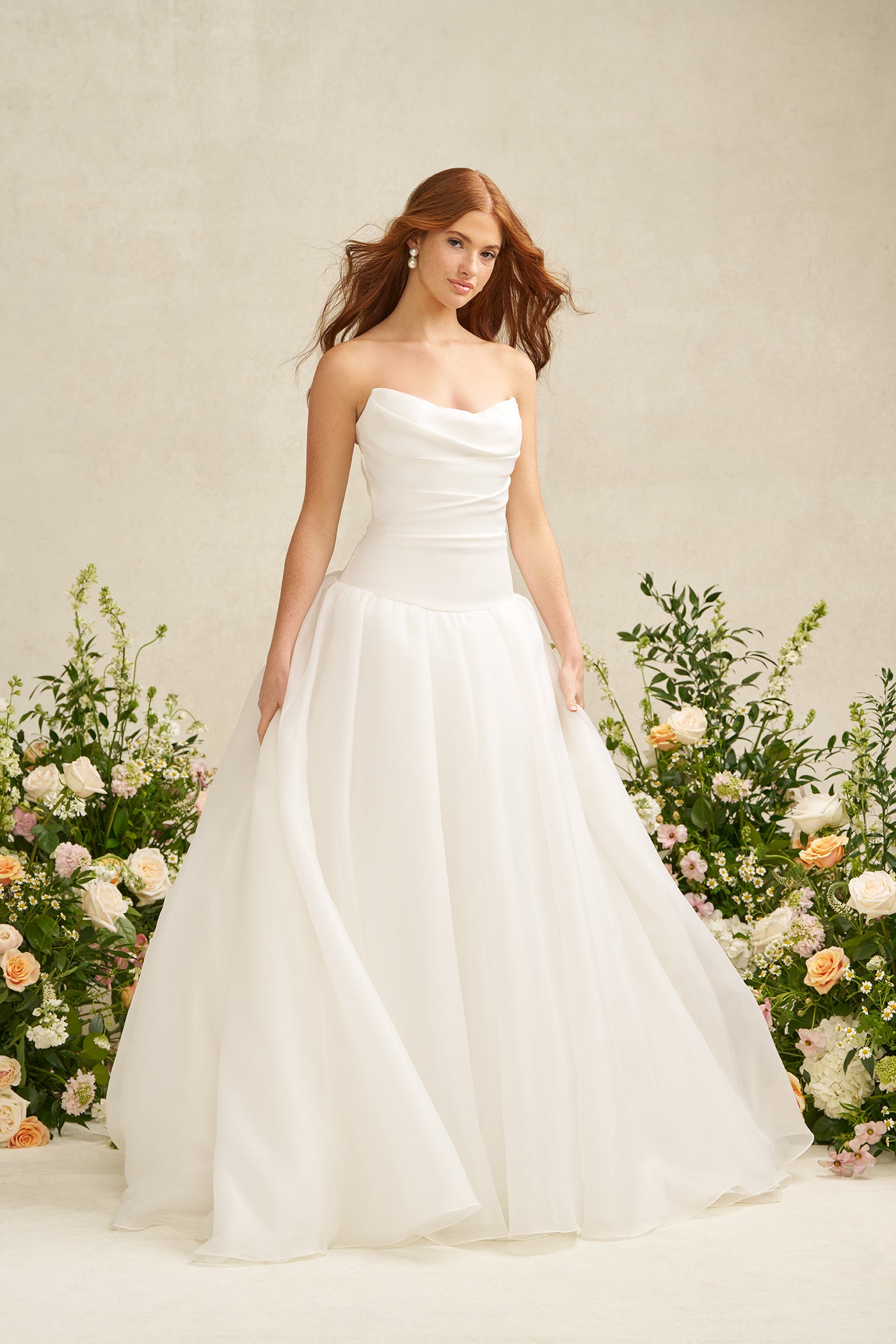 Classic and graceful, this A-line gown features a ruched satin bodice paired with a softly structured organza skirt. The scoop neckline and dropped waist create a flattering, elongated silhouette, blending timeless design with a light, romantic finish. Simple yet refined, this gown capt... Read More