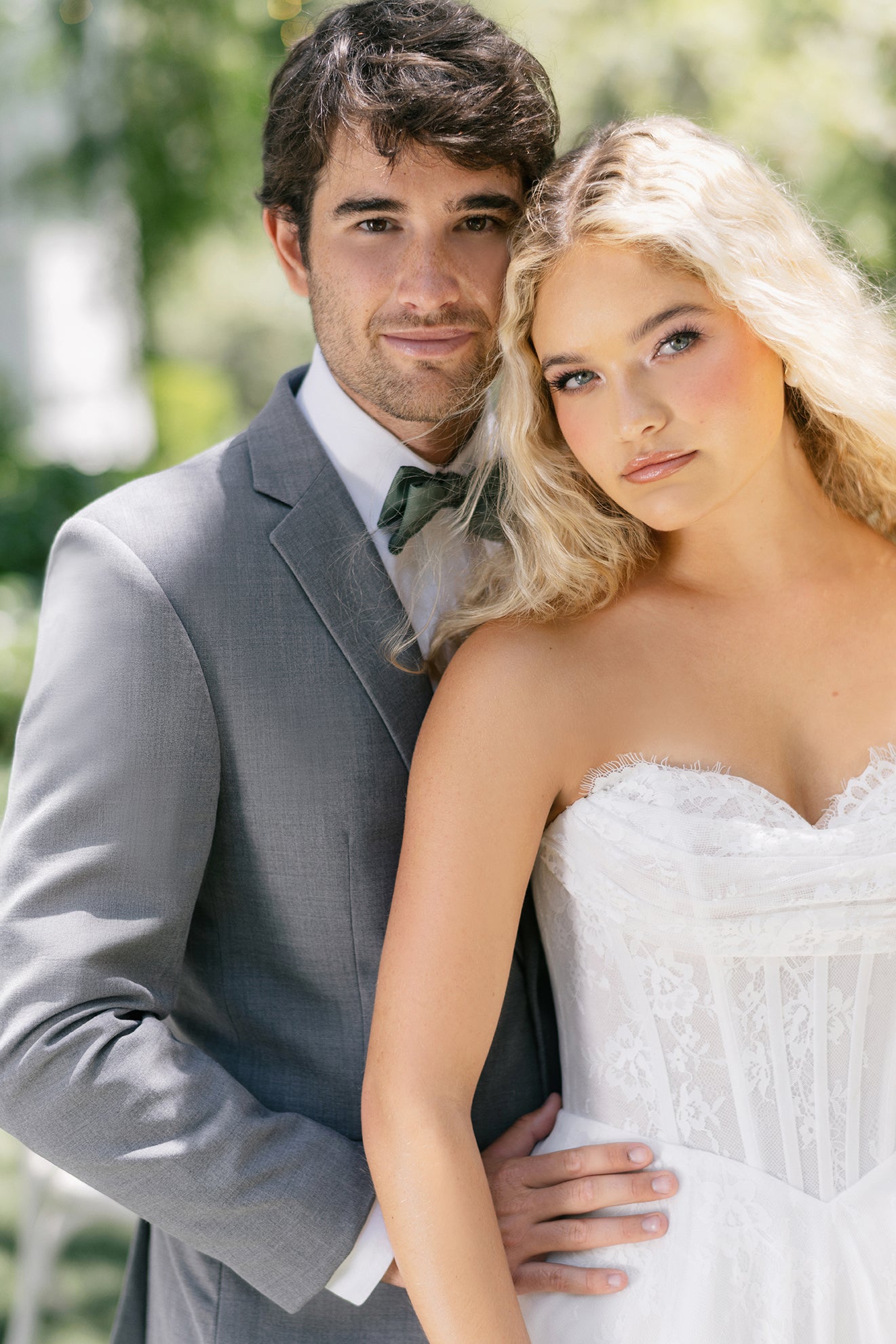 Softly romantic and effortlessly graceful, this strapless A-line gown pairs Chantilly lace with a sheer tulle overlay for a layered, ethereal effect. The sweetheart neckline and basque waist flatter the figure, while a subtle slit adds a hint of modern movement. Finished with delicate eyelash lace trim along the edges, this gown captures timeless bridal beauty with a fresh, natural charm. Pair with Veil Style V087C (sold separately) for a coordinated finish. Read Less