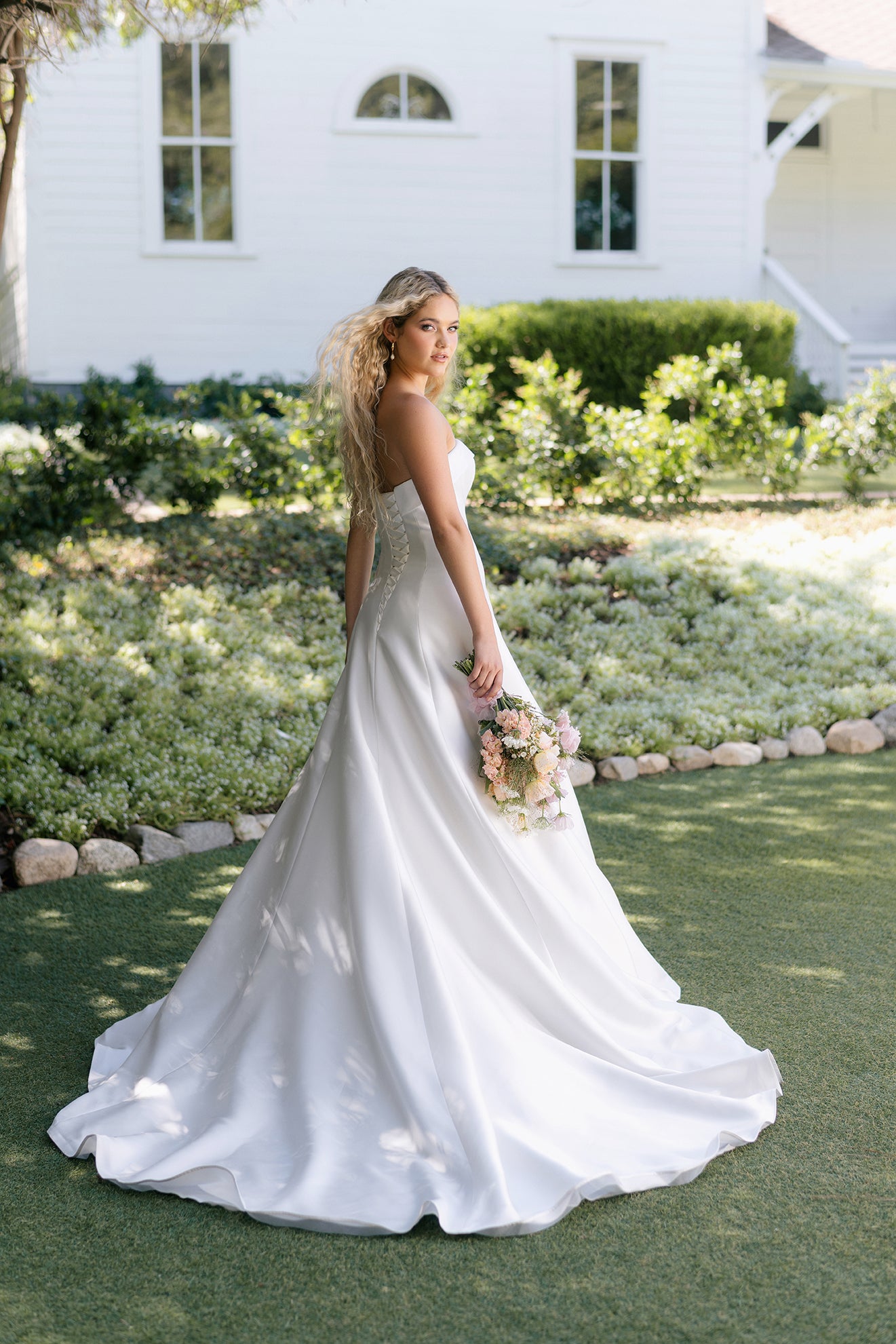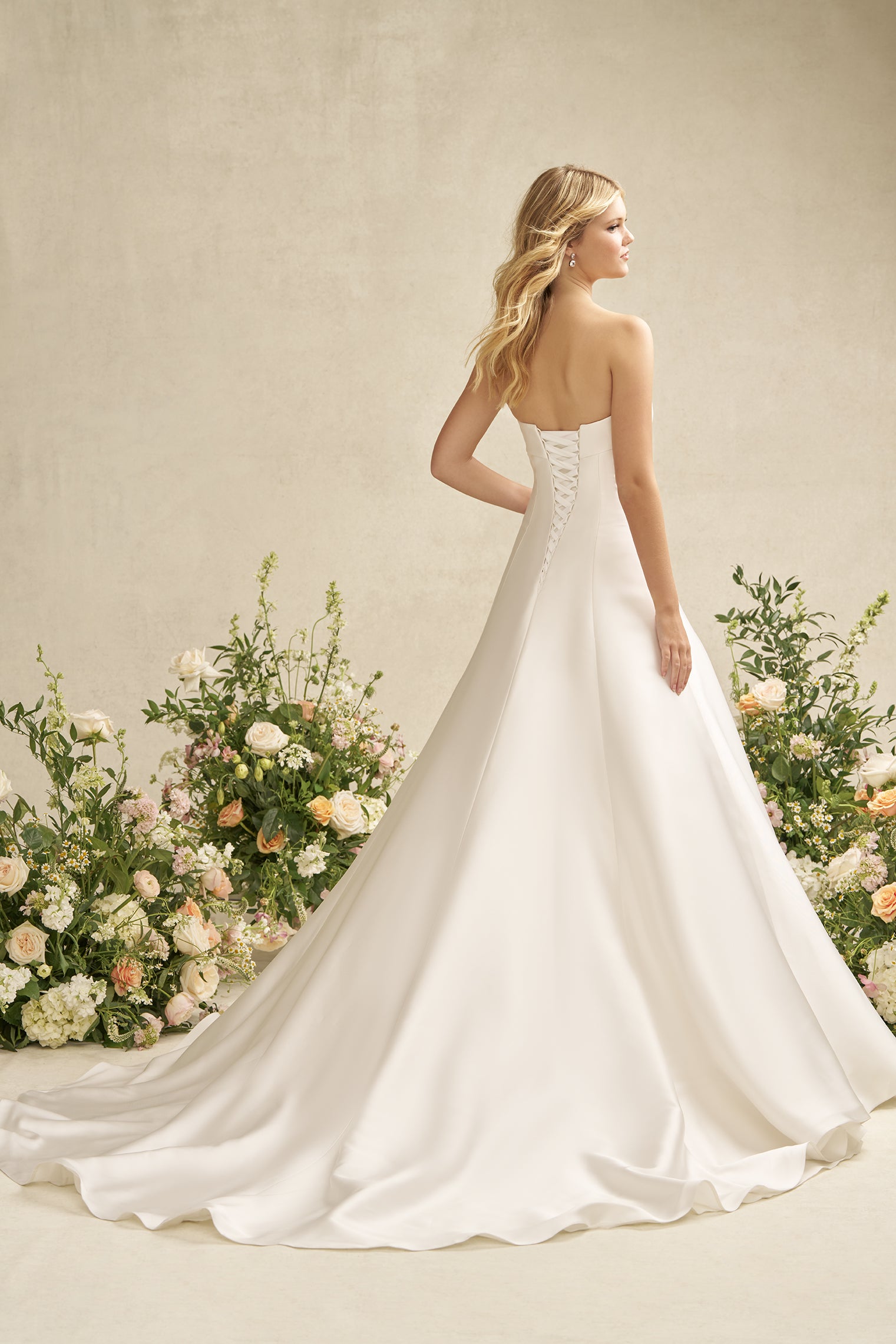 Crisp and structured, this strapless A-line gown is crafted from luminous Mikado for a clean, modern silhouette. The corseted bodice features a soft rolled neckline that adds subtle dimension and polish, while the full skirt creates graceful volume and balance. Elegant and understated, this gown celebrates classic bridal tailoring with a fresh, refined finish. Read Less