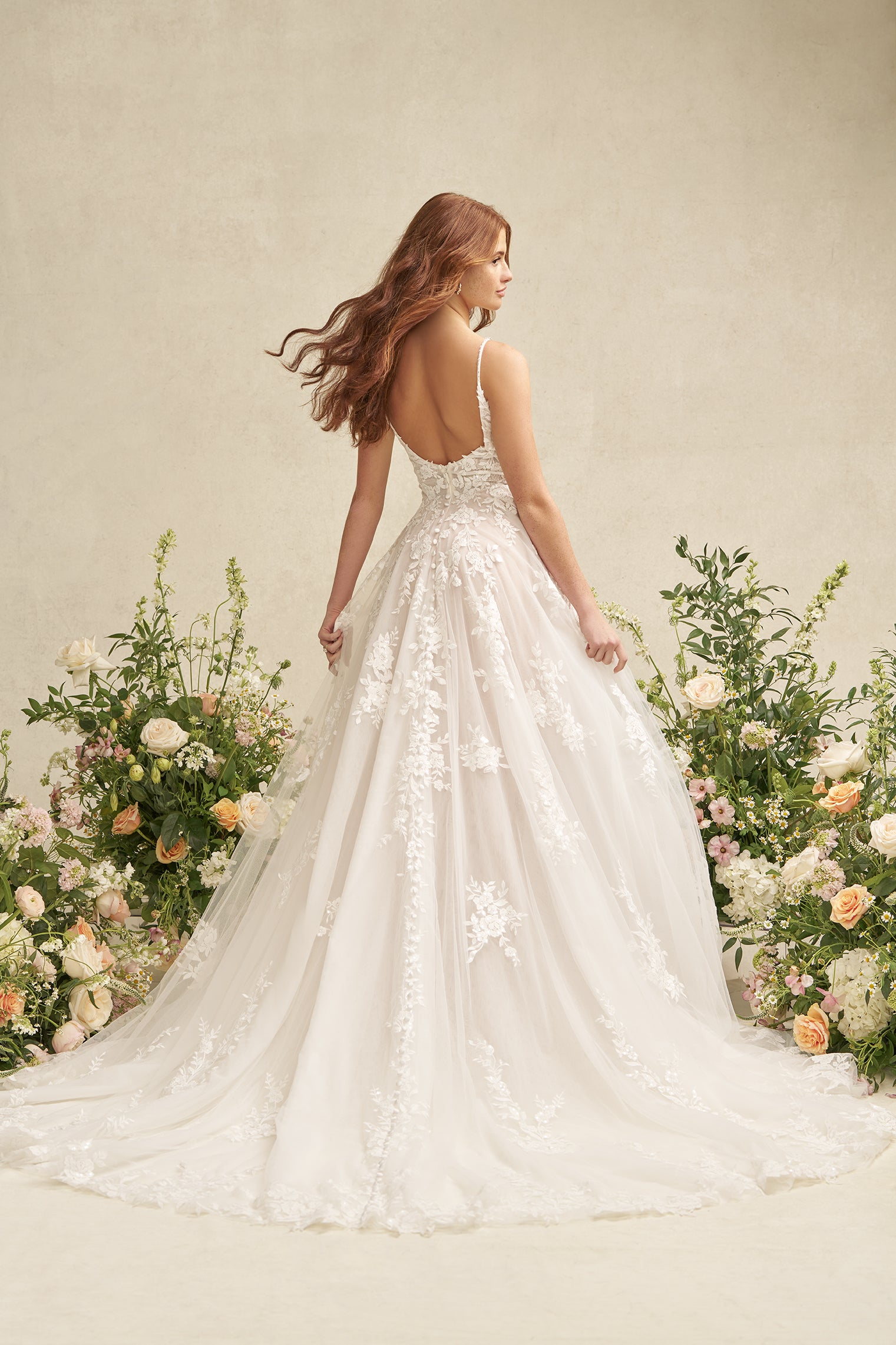 Light and effortless, this A-line gown features sequin lace appliques that shimmer softly across layers of airy tulle. The V-neckline and slender spaghetti straps create a graceful frame, while the natural waist flows into a full, romantic skirt. Designed with delicate movement and subtle sparkle, this gown embodies a fresh, graceful take on classic bridal beauty. Read Less