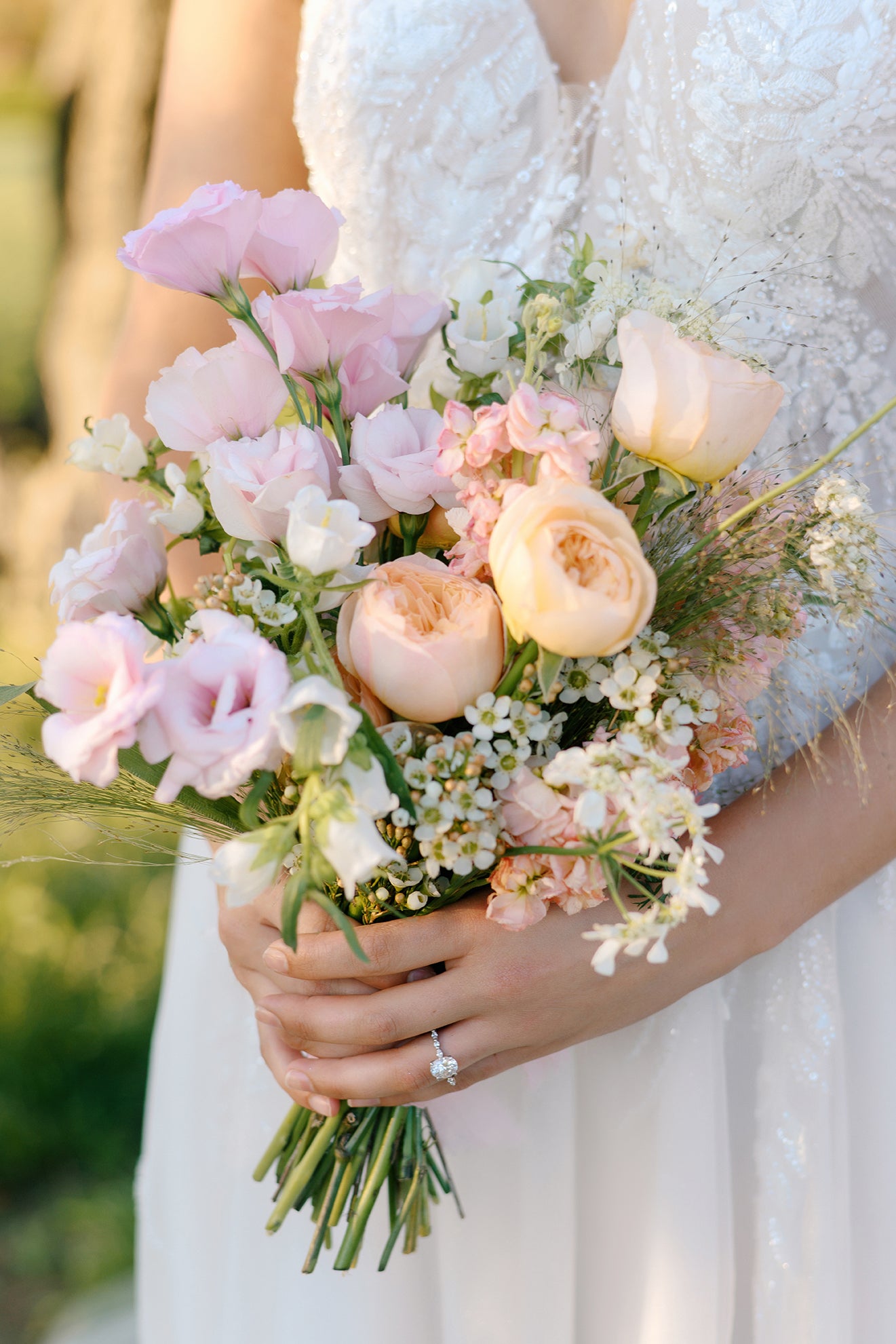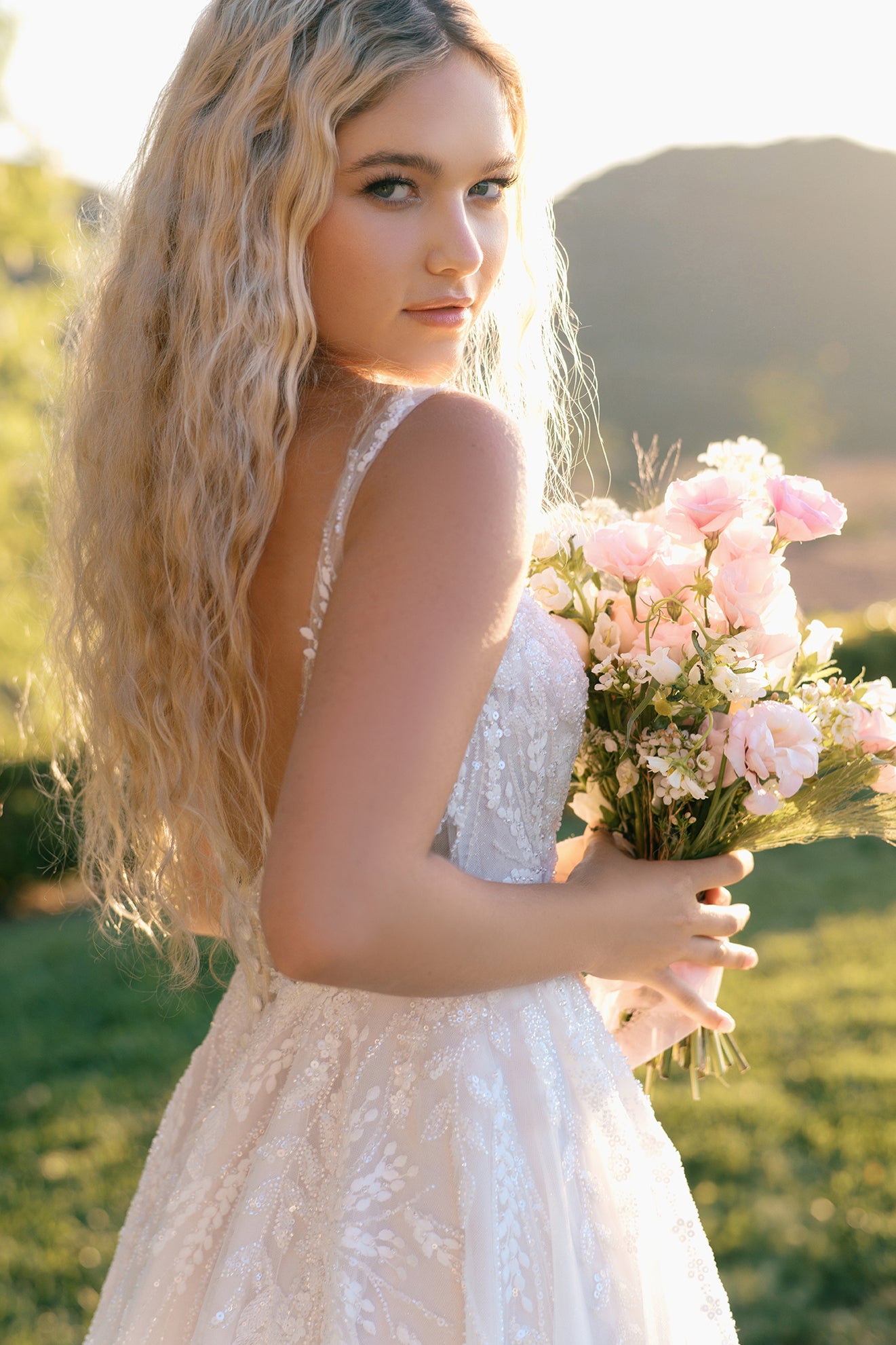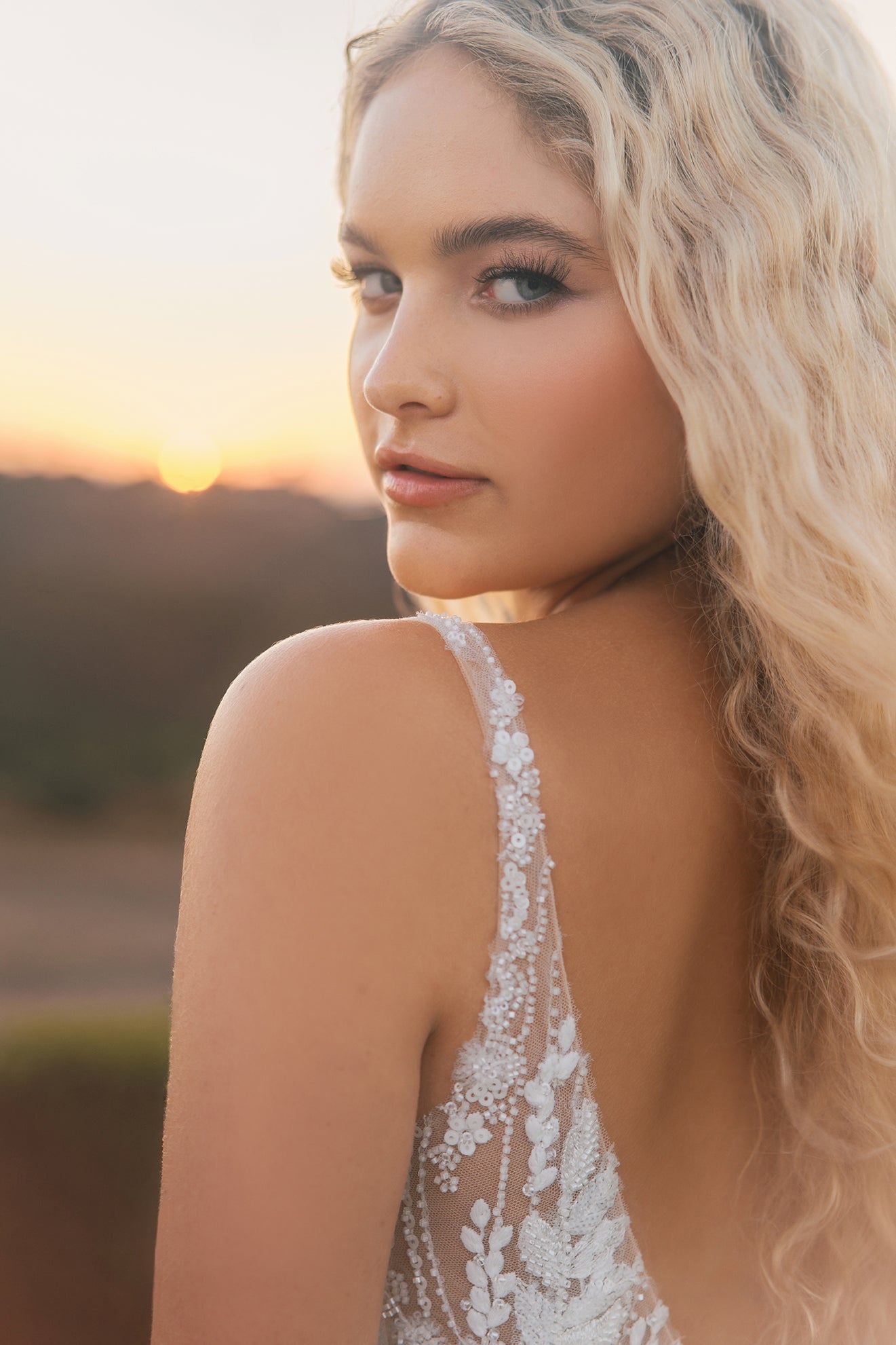 Radiant and graceful, this A-line gown features pearl, beaded, and embroidered lace appliques that glisten over layers of sparkle tulle. The V-neckline and slender straps create a flattering, open frame, while the natural waist flows into a soft, sweeping skirt. With its gentle shimmer and intricate lacework, this gown captures a beautifully romantic sensibility with just the right touch of light-catching detail. Read Less