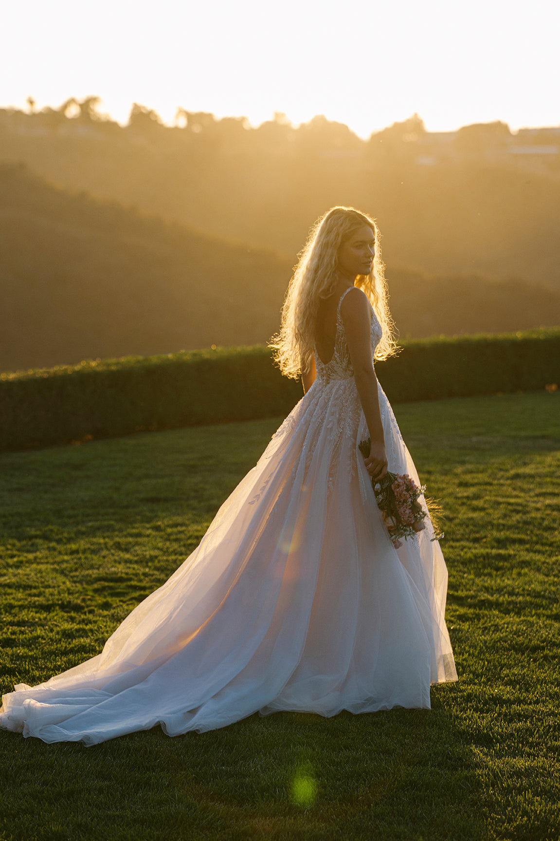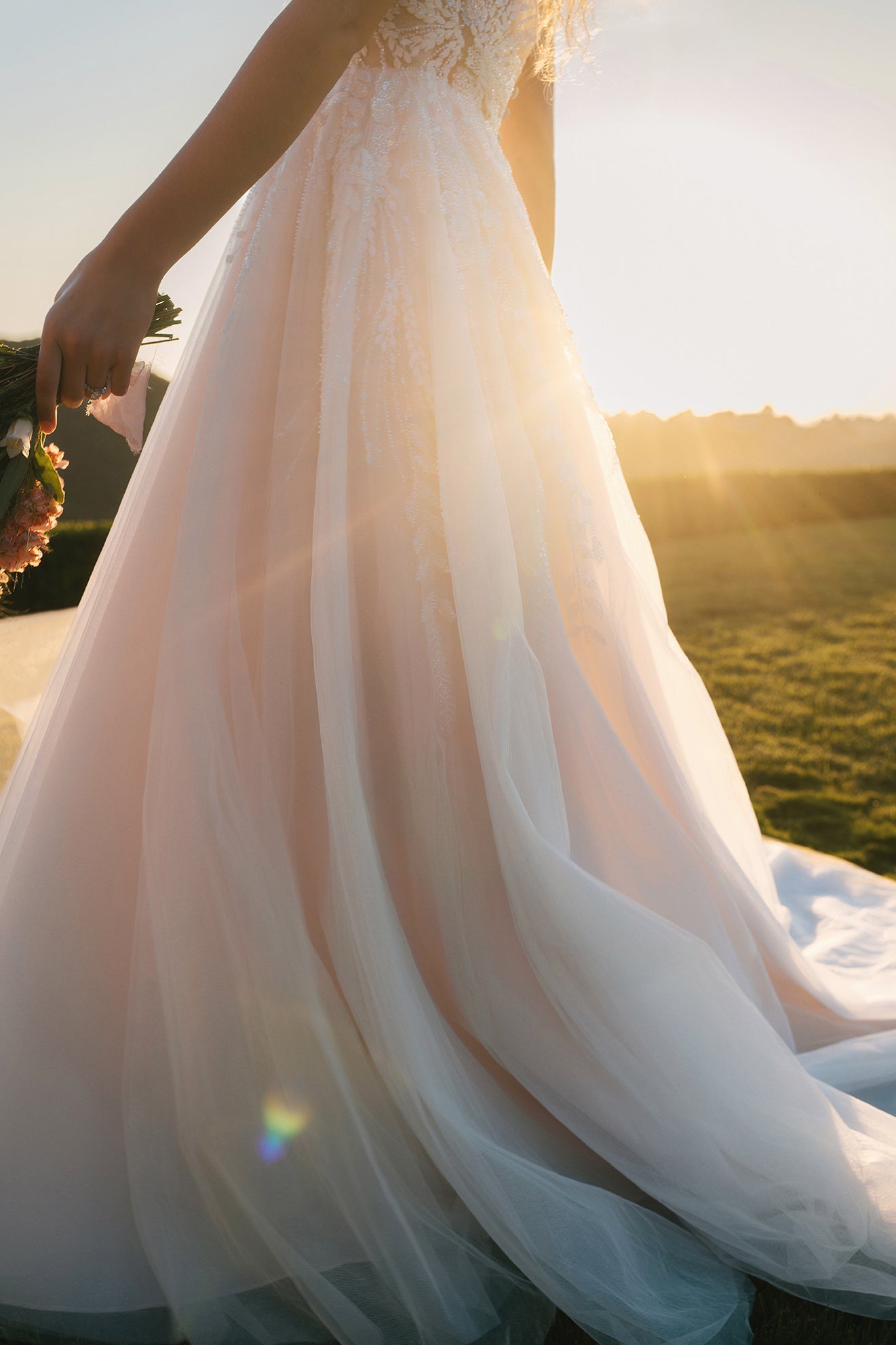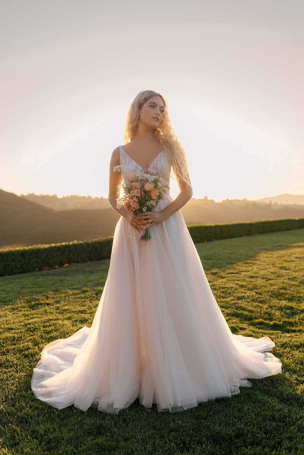 Radiant and graceful, this A-line gown features pearl, beaded, and embroidered lace appliques that glisten over layers of sparkle tulle. The V-neckline and slender straps create a flattering, open frame, while the natural waist flows into a soft, sweeping skirt. With its gentle shimmer ... Read More
