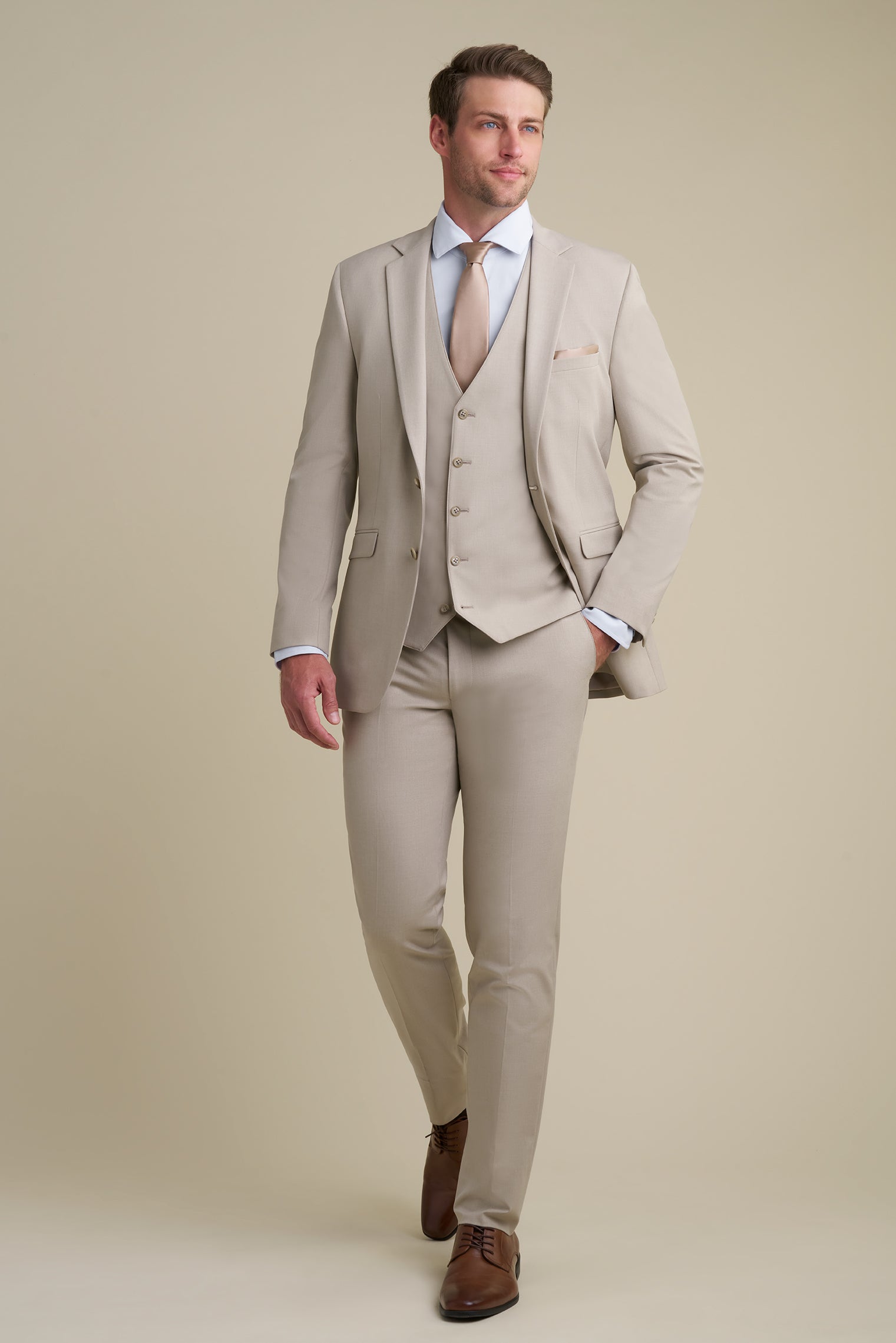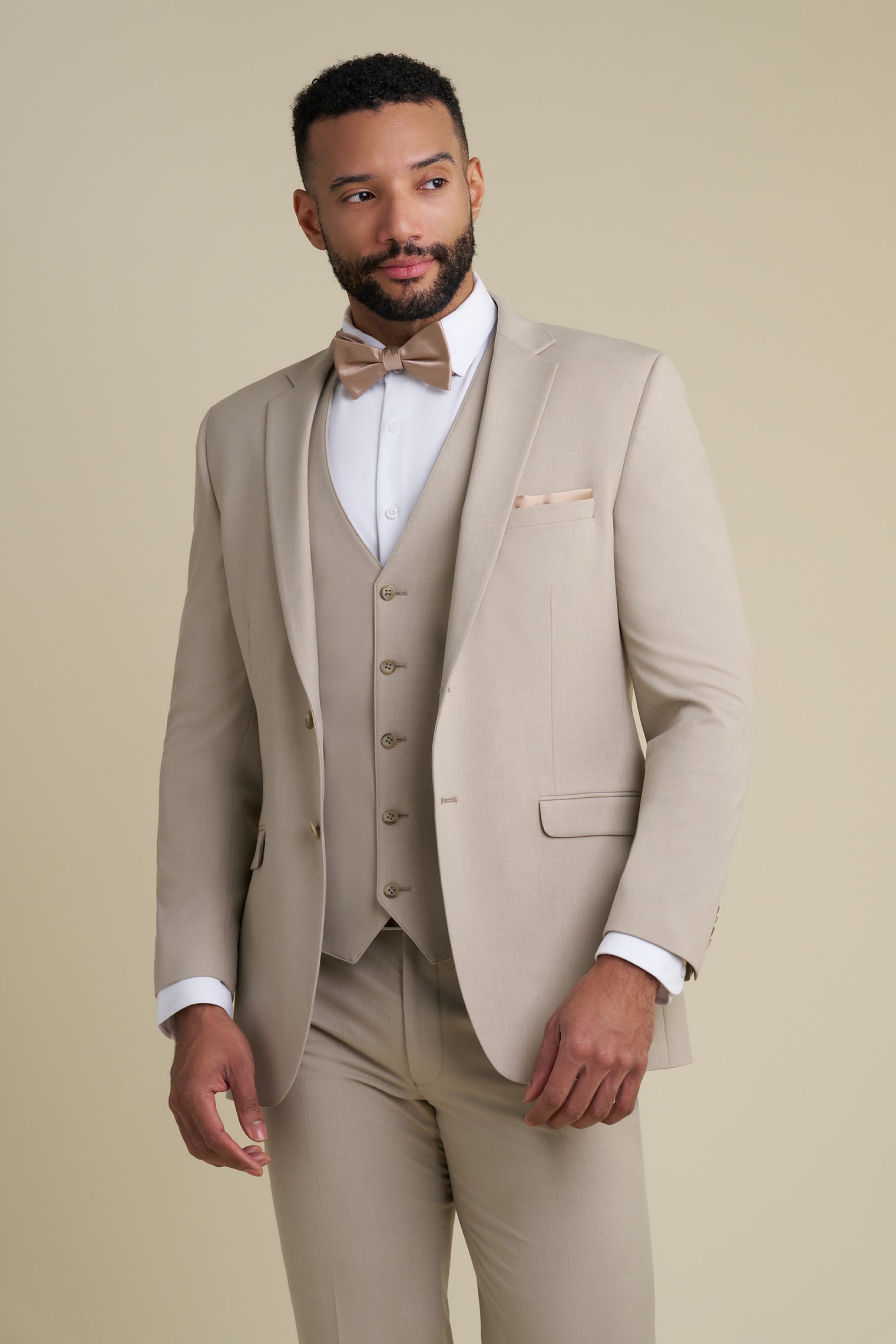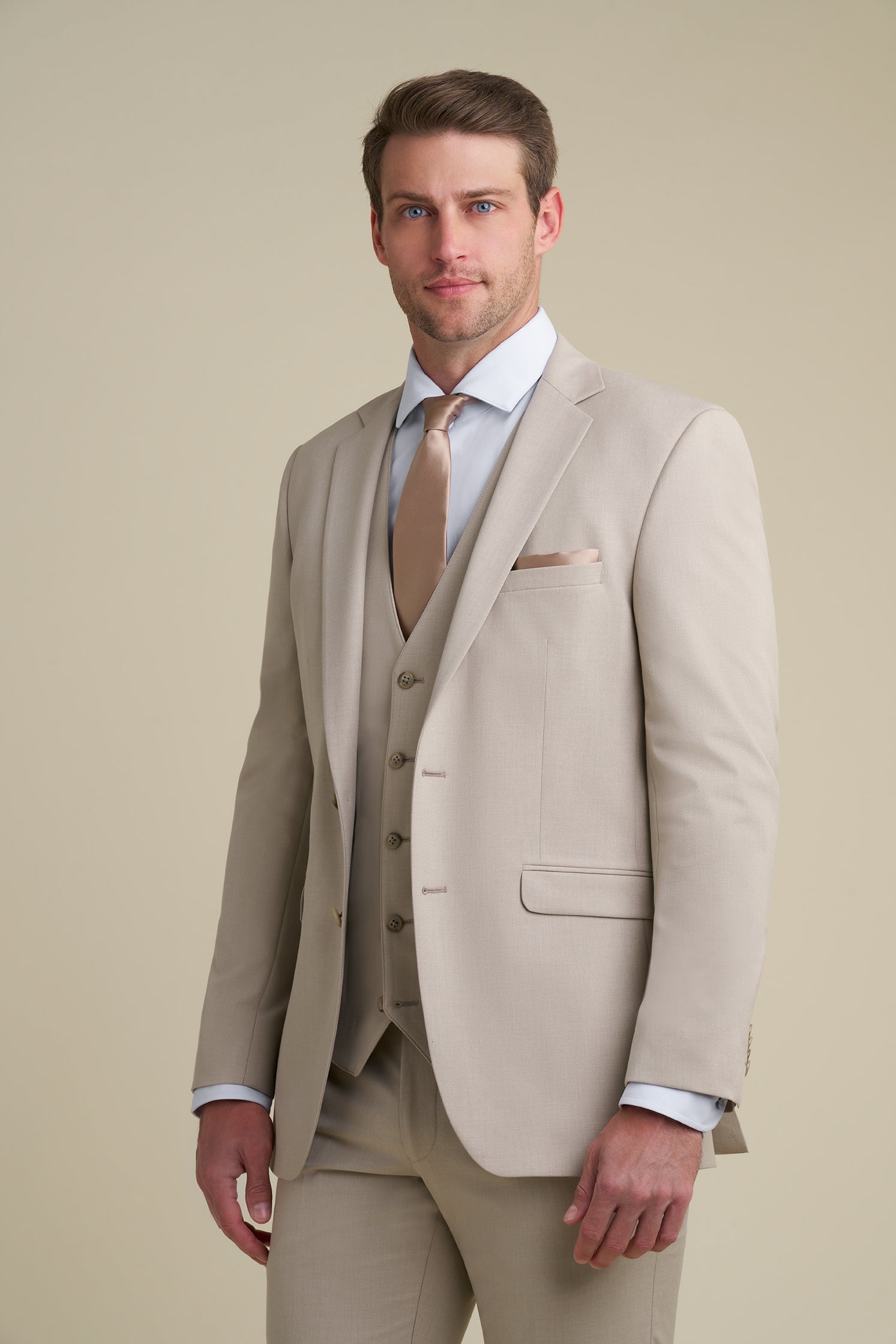 Of the many suit colors, tan is a popular choice for men who want a simple yet stylish look. This tan notch lapel suit is a classic and versatile piece that you can wear for any formal event; it looks dapper on a groom and also makes a great choice for guests. This suit is a must-have for any man who enjoys timeless, stylish attire. Find it at your local Allure Bridals retailer today. Also available in Big and Tall or Youth sizes. Read Less