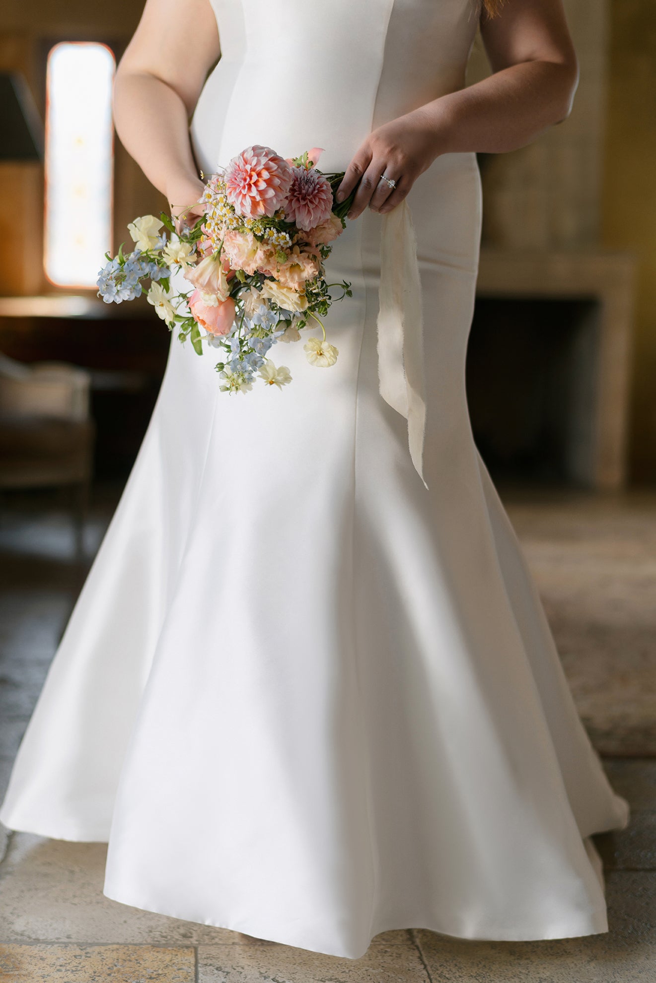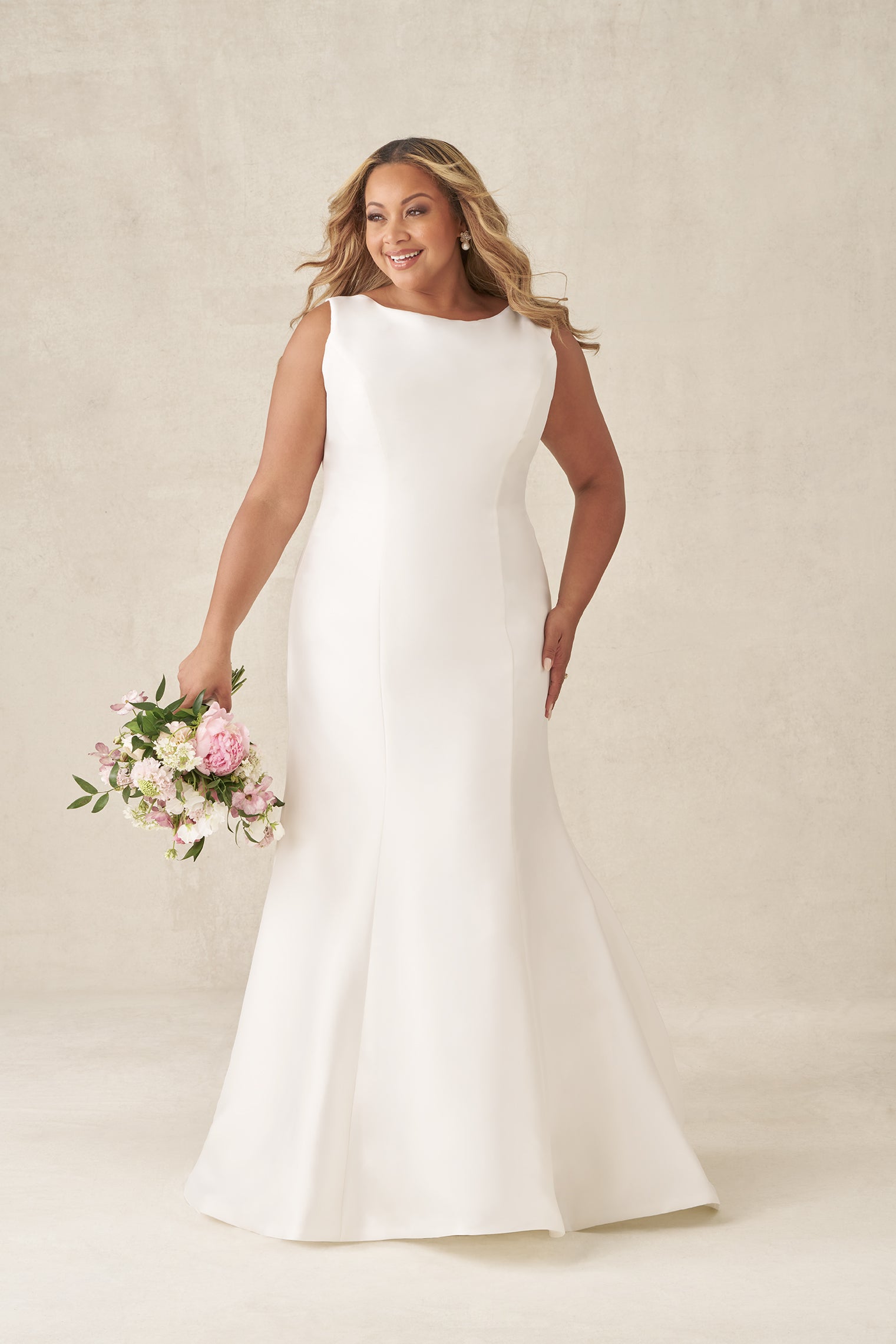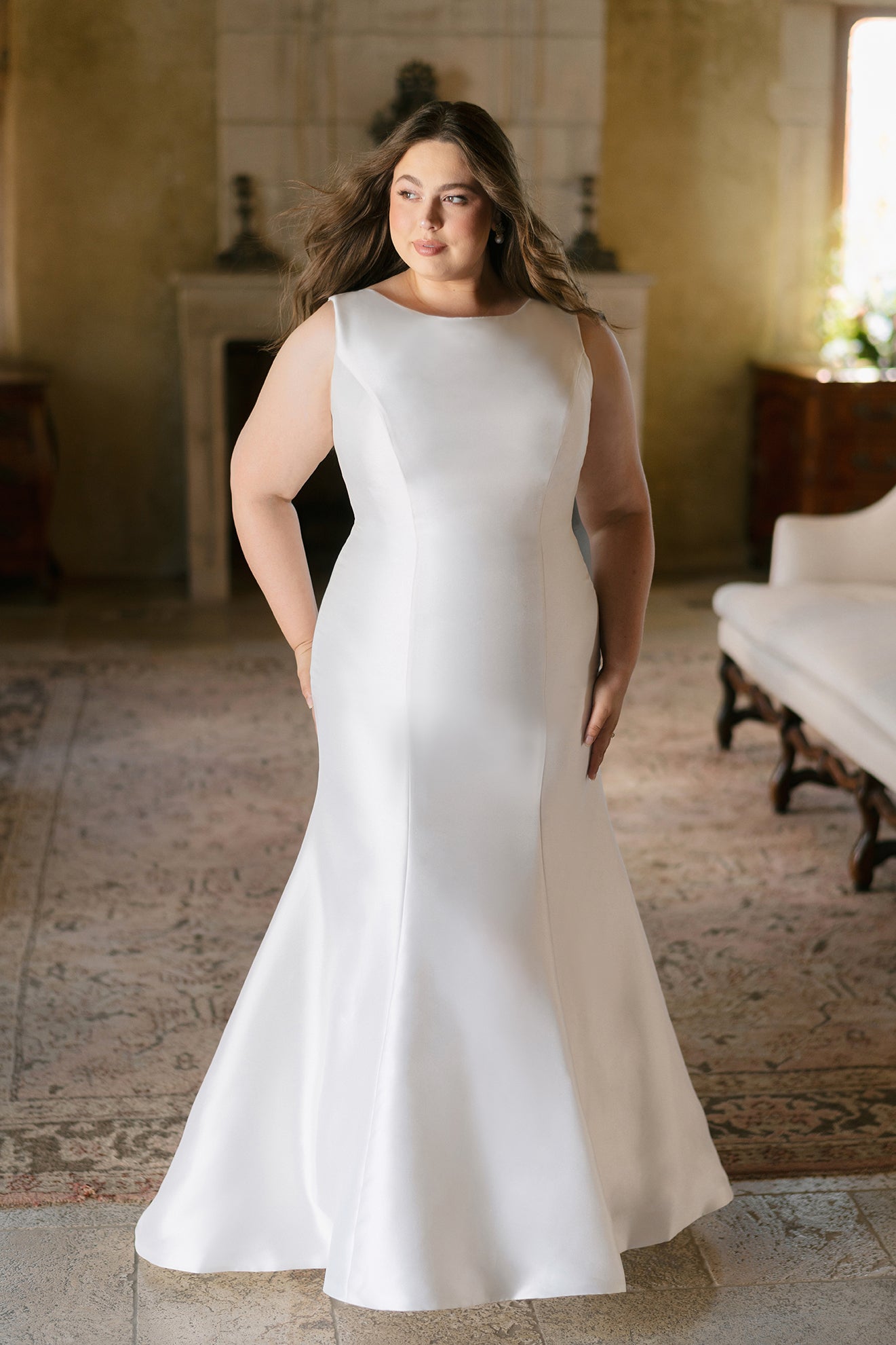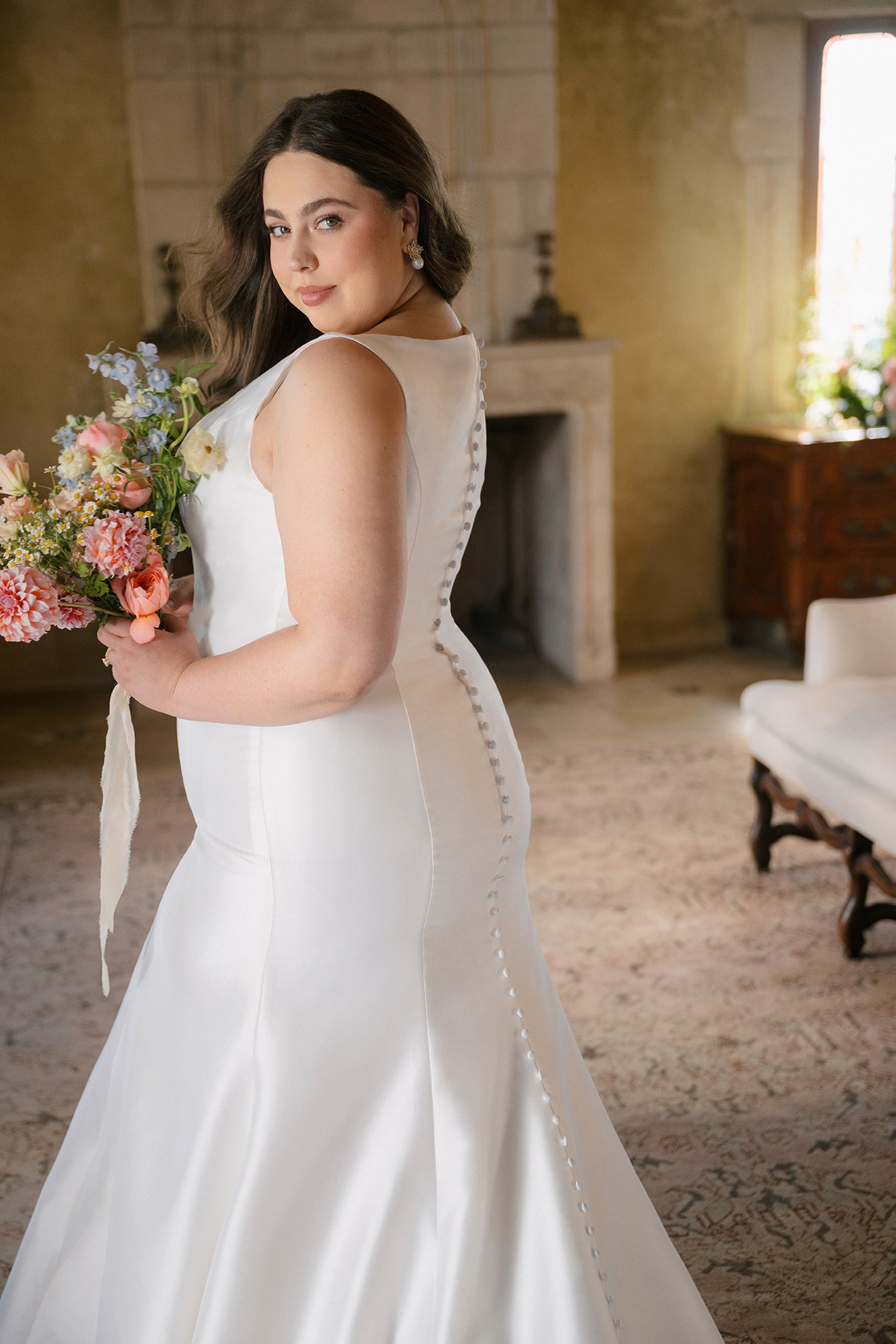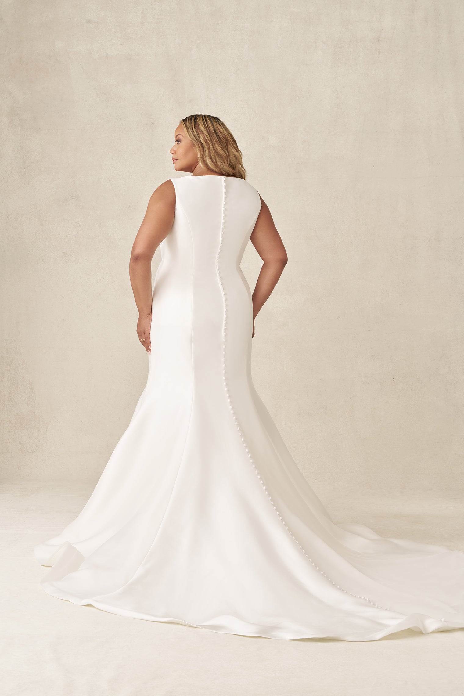 This fit-and-flare gown is crafted from structured Mikado, featuring a classic boat neckline for a timeless, elegant look. Clean lines and thoughtful construction provide subtle support, while buttons trailing down the back add a refined, polished detail.