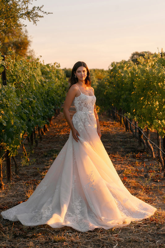 Photographed at the breathtaking Cal-a-Vie Spa in Vista, California—a haven where French elegance meets California sunshine—the Allure Bridals Spring 2026 collection celebrates the art of timeless design. Inspired by the property’s European charm, this season returns to classic craftsmanship with hand-beaded bodices, sculpted corsetry, and dramatic necklines that evoke romance and sophistication. From natural to basque to dropped waistlines, each silhouette is a study in proportion and grace, while new accessories invite brides to personalize their look. Flowing bridal scarves, detachable sleeves, and sweeping overskirts transform each gown from ceremony to celebration—capturing the effortless luxury and modern versatility that define today’s bride.