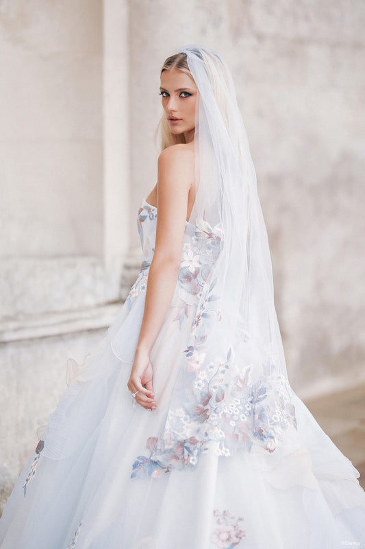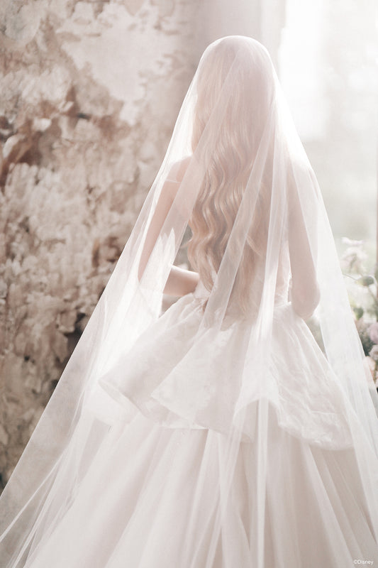 This cathedral-length veil captures Rapunzel’s radiant spirit and the magic of her story. Crafted from delicate tulle and edged in matching lace, it reflects the gown’s whimsical artistry — a nod to the creativity and wonder that define her world. Flowing like sunlight through the tower window, it trails behind with luminous grace, a finishing touch for the bride whose light was always meant to shine beyond the walls that once held her.