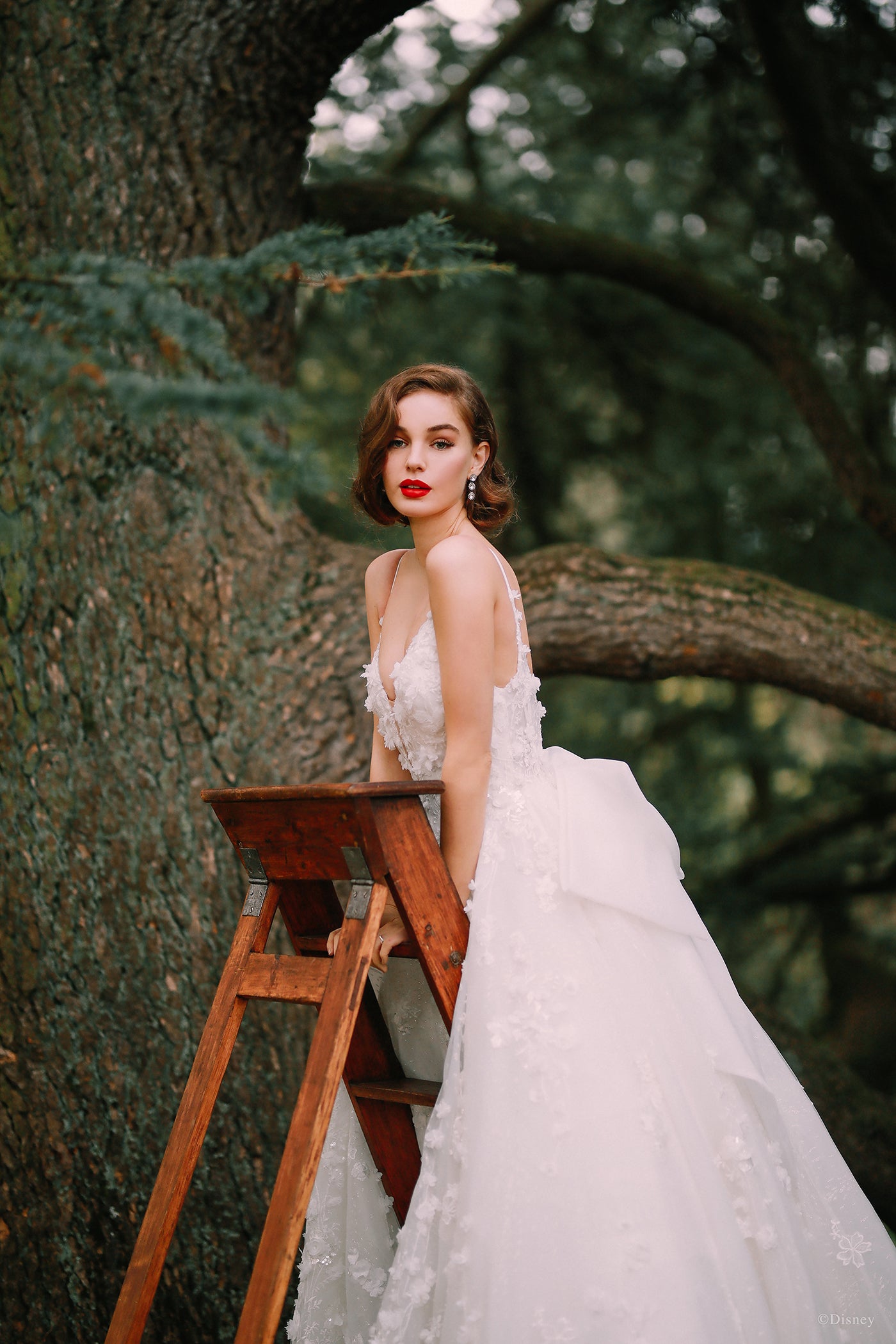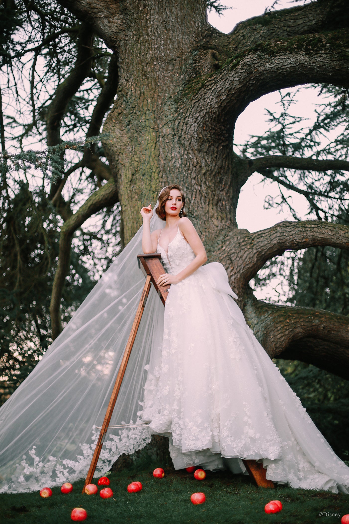 Capturing Snow White's grace and beauty, this Platinum ballgown features embroidered lace, seed beads, crystals and three-dimensional 'apple blossoms' scattered across sparkle tulle. A sweetheart neckline and organza bow is the finishing touch to this romantic, timeless gown. Shown with matching veil, DV05, solde separately. Read Less