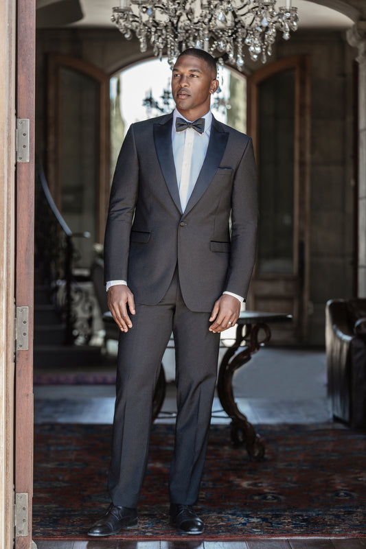 An elevated take on a classic, the ultra black tuxedo features a rich, deep black fabric paired with a bold contrasting satin peak lapel. The tailored fit creates a sleek, modern silhouette, making it a striking choice for weddings, galas, and black-tie events.