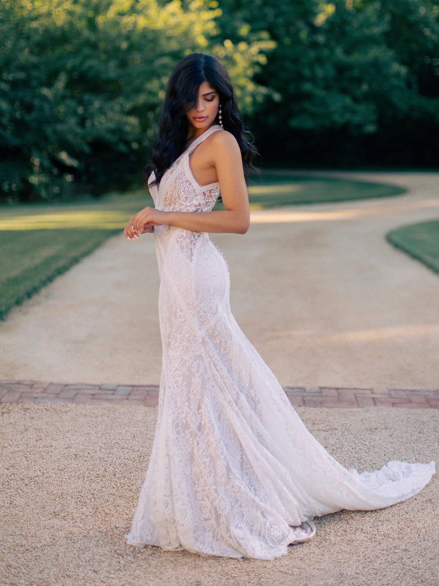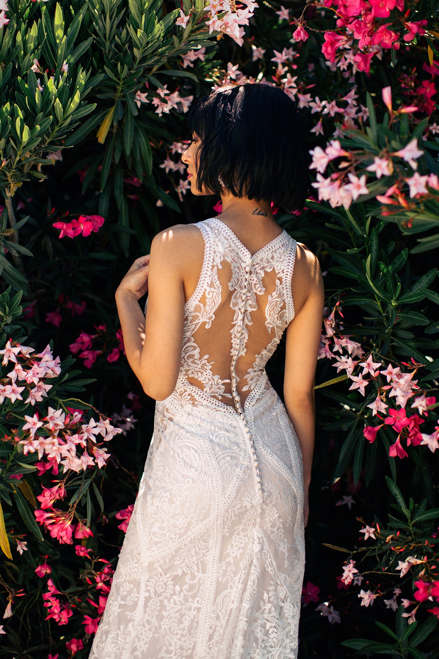 Inspired by 1960s halter silhouettes, Blakeley features soft sheet lace and a surprise illusion back.